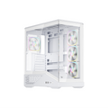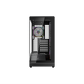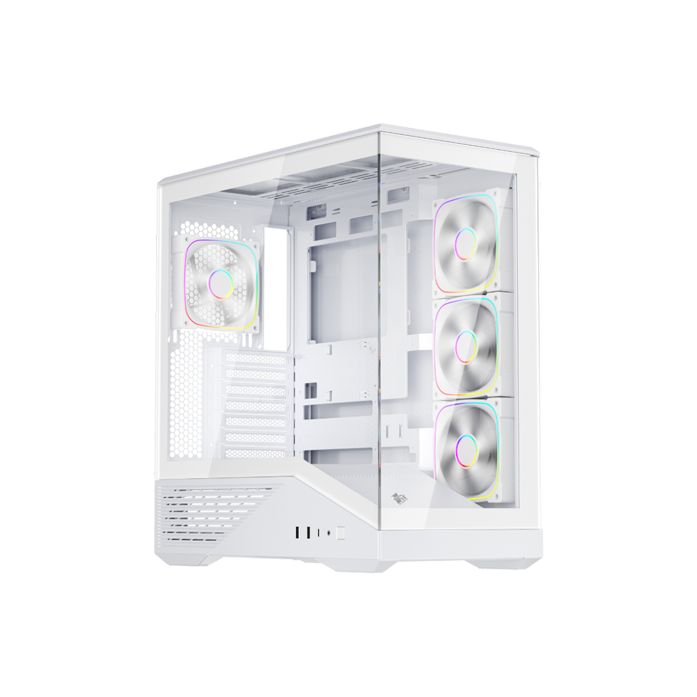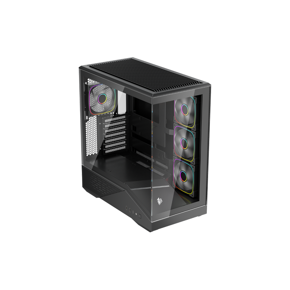 ARGB Fans & Tempered Glass Panel - Includes 4 addressable RGB fans (3 on the side, 1 rear) that add lighting and airflow; the tempered glass side panel shows off internal hardware and lighting effects.
