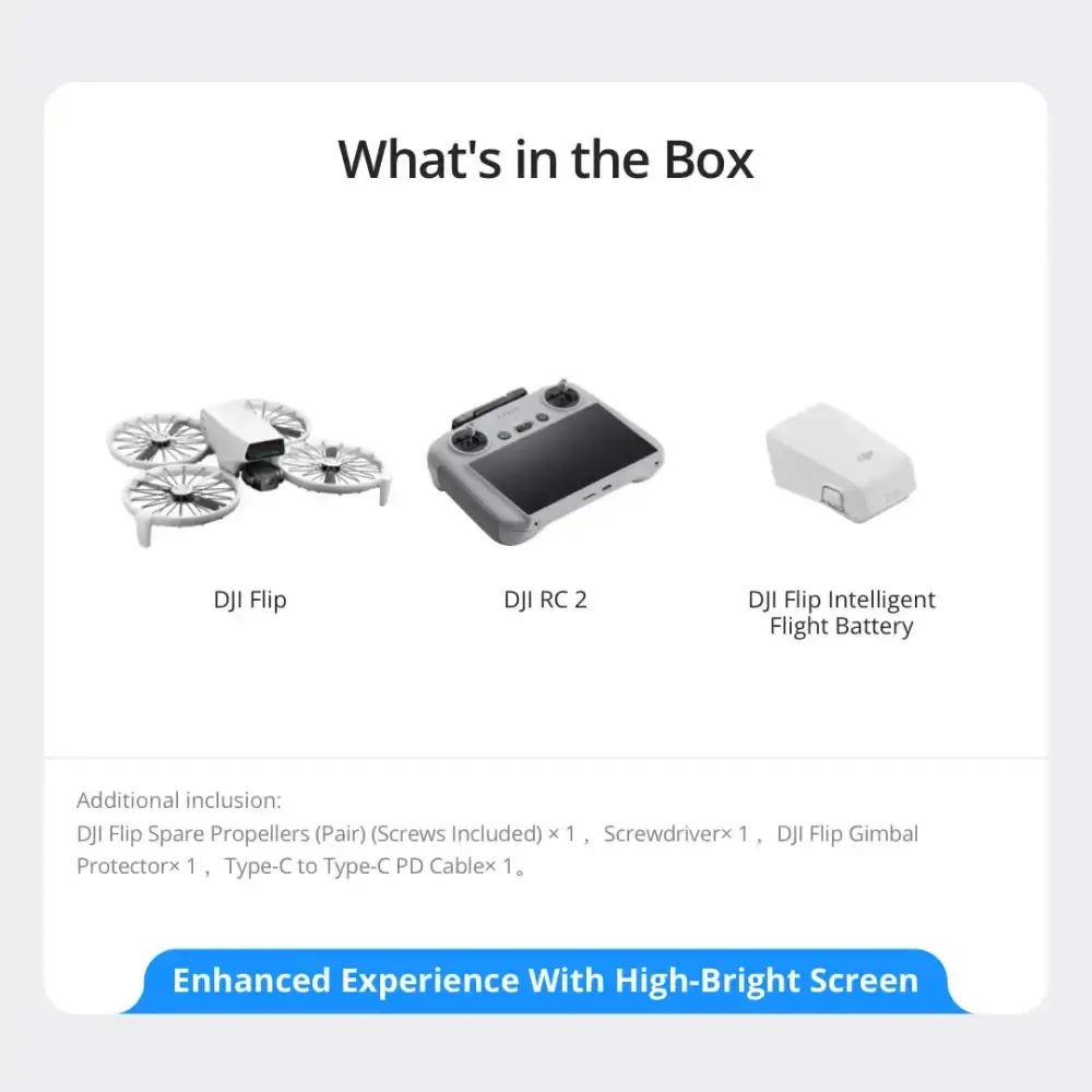 Intuitive DJI RC 2 Controller with 5.5" Display - The DJI Flip includes the RC 2 controller with a 5.5" FHD 700-nit display, offering precise control and clear visuals. Ideal for beginners and pros, it enhances aerial photography with seamless navigation and an intuitive interface for effortless operation.
