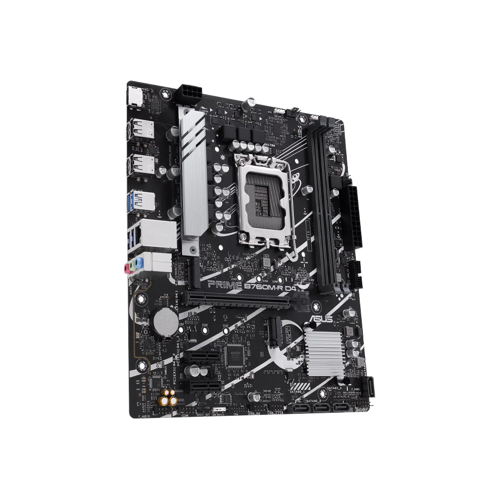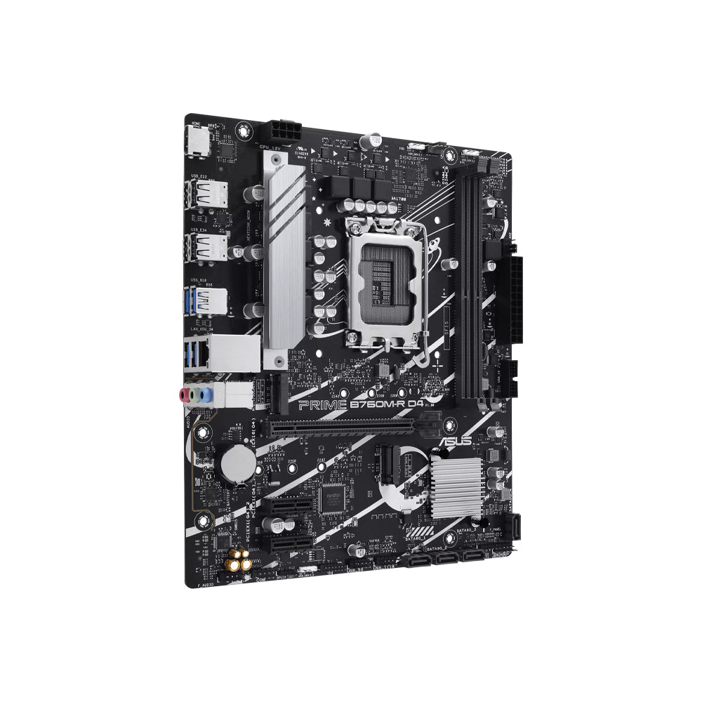 The ASUS Prime B760M-R D4 is a Micro-ATX Intel® B760 motherboard with LGA1700 support for 12th/13th/14th Gen CPUs, dual-channel DDR4 memory, dual PCIe 4.0 M.2 slots, 2.5 Gb Ethernet, HDMI 2.1 and high-speed USB connectivity. With PCIe 4.0 graphics and multiple storage options, it’s ideal for mainstream gaming and productivity PC builds.