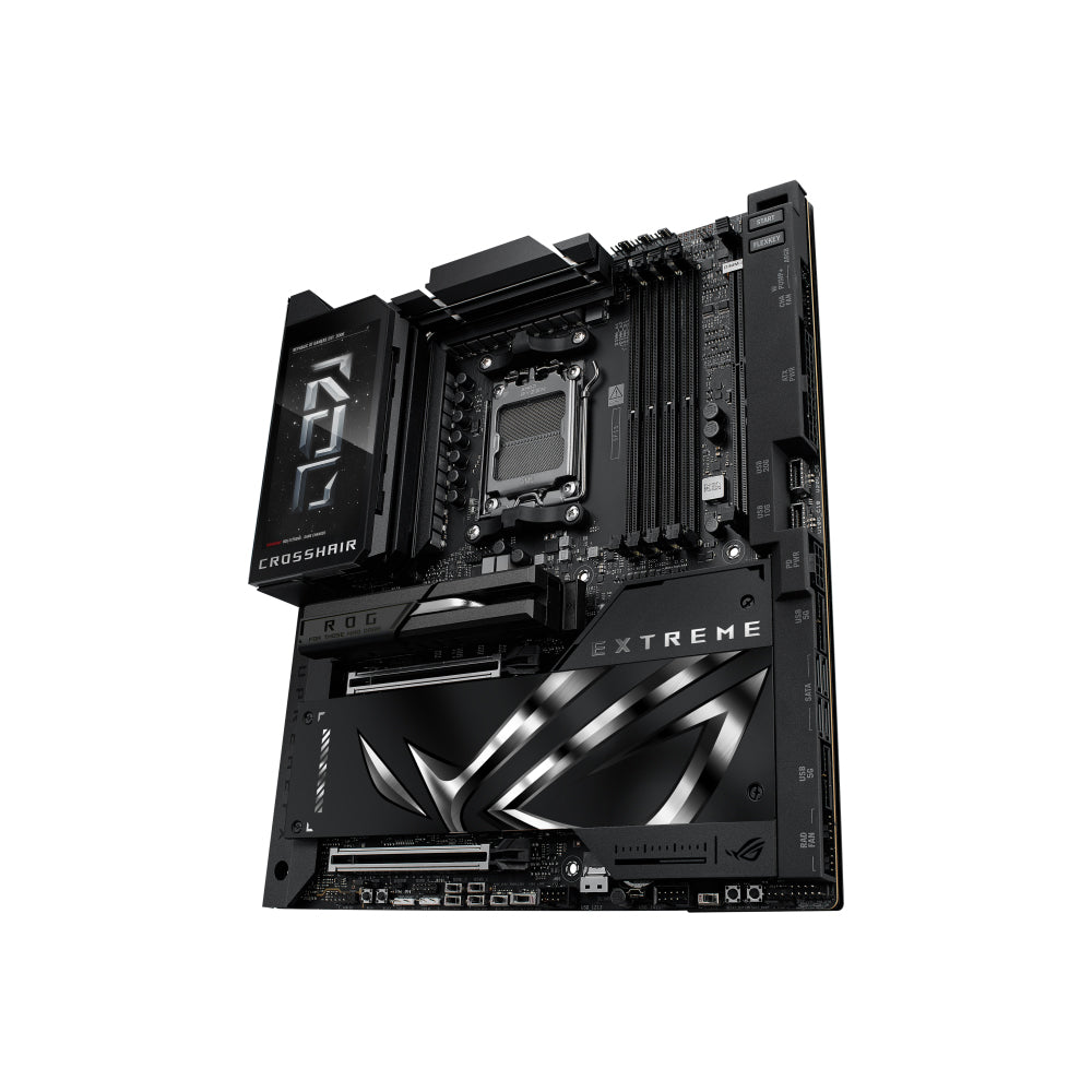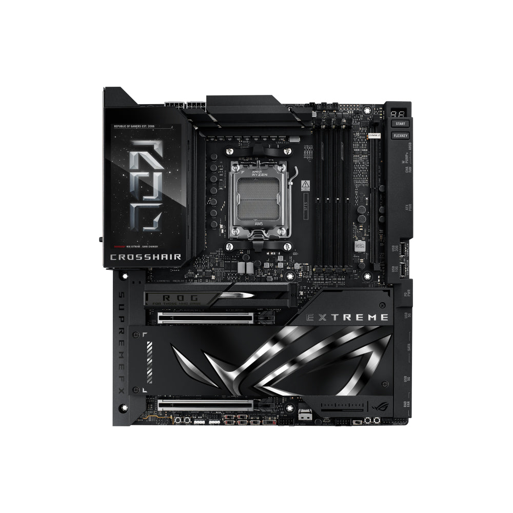 The ASUS ROG Crosshair X870E Extreme is a top‑tier E‑ATX motherboard built on the AMD X870E chipset for Ryzen 7000/8000/9000 CPUs. It excels in high‑end builds with PCIe 5.0 for CPU/GPU/M.2, Wi‑Fi 7, 10Gb + 5Gb Ethernet, vapor‑chamber cooling, AI‑driven tools, and an integrated 5″ LCD for live system monitoring.