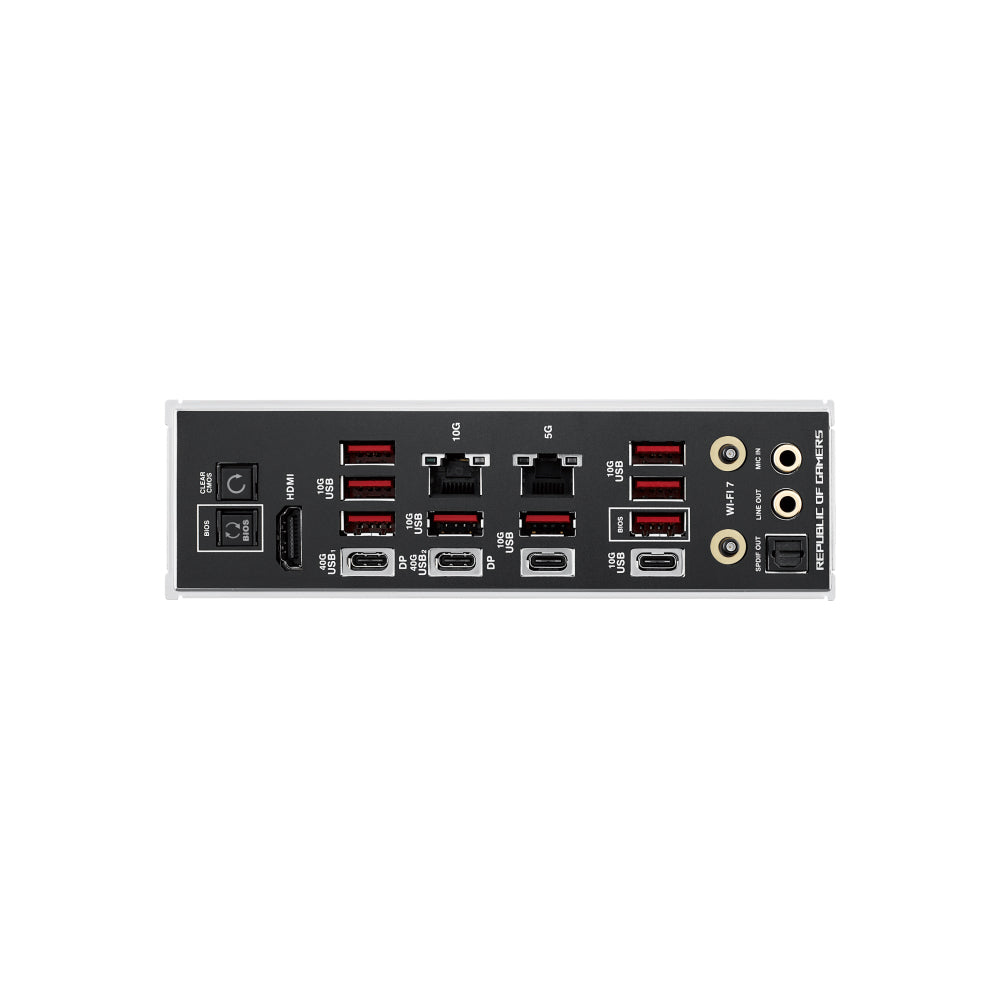 Extreme Connectivity Suite - Dual PCIe 5.0 x16 GPU slots (x16/x8/x8), three onboard PCIe 5.0 M.2 slots plus two more via ROG Q‑DIMM.2, SlimSAS Gen4 connector, dual USB4 40 Gbps Type‑C, USB 20 Gbps + 10 Gbps front‑panel connectors, Wi‑Fi 7 + Bluetooth 5.4, and 10 Gb + 5 Gb Ethernet ports.
