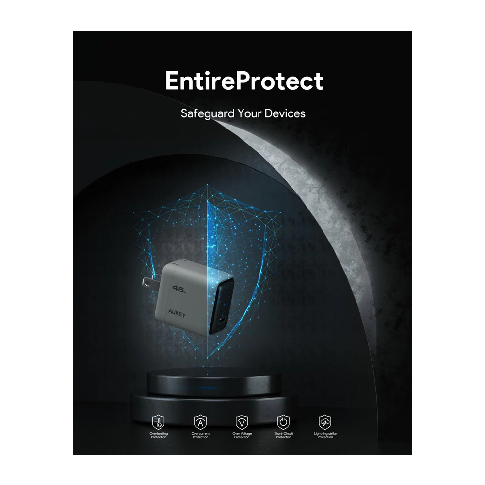 45W High-Speed Power Delivery with GaN Technology - The AUKEY PA-C2 Comet delivers 45W PD fast charging, powered by advanced GaN technology for enhanced efficiency and reduced heat generation. Perfect for MacBook Air, iPhone, and Samsung Galaxy devices, it ensures quick, reliable power in a compact, travel-friendly design, making it ideal for on-the-go professionals.
