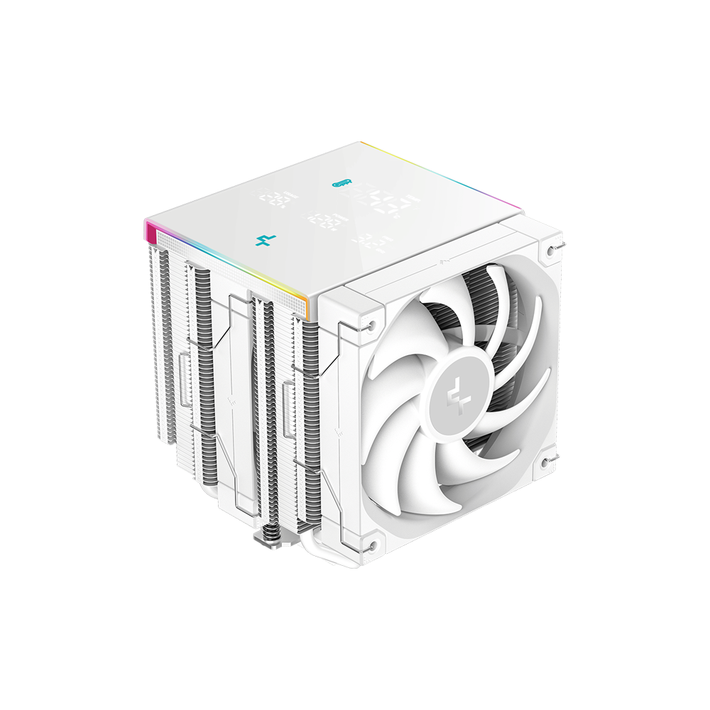The DeepCool AK620 DIGITAL PRO WH Air Cooler (White) delivers superior CPU cooling with a dual-tower design, six copper heat pipes, and a digital display. Featuring CTT 2.0 technology and ARGB lighting, it optimizes performance for Intel and AMD gaming PCs.
