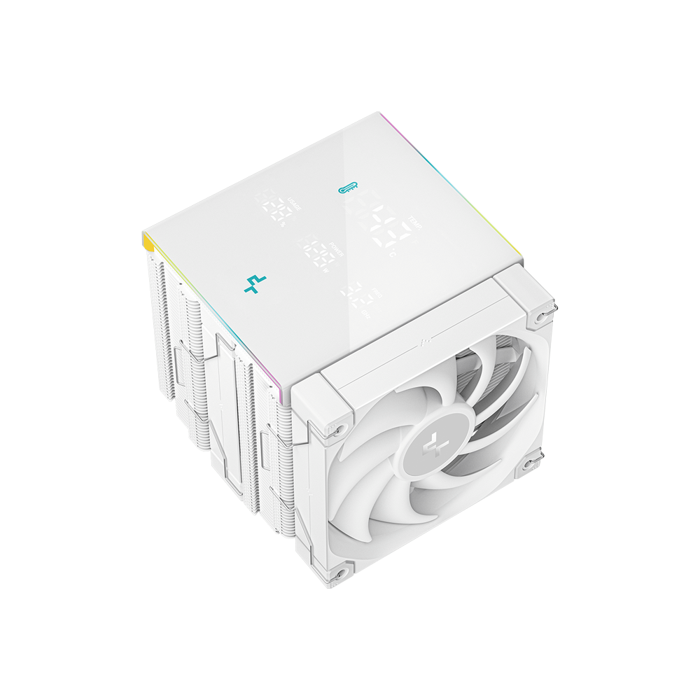 High-Efficiency FT12 SE PWM Fans - The DeepCool AK620 DIGITAL PRO WH includes two 120mm FT12 SE PWM fans, optimized for 68.99 CFM airflow and low noise. Operating at 500-1850 RPM, they ensure efficient cooling, perfect for gaming PCs requiring balanced performance and quiet operation.