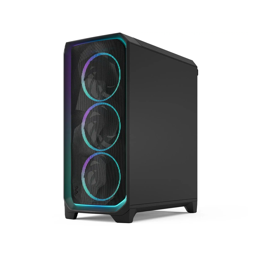 High-Airflow Angular Mesh Front - Signature angular mesh front panel maximizes air intake, ensuring optimal cooling efficiency for high-performance CPUs and GPUs while maintaining a bold design.