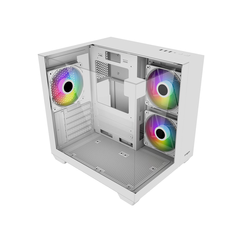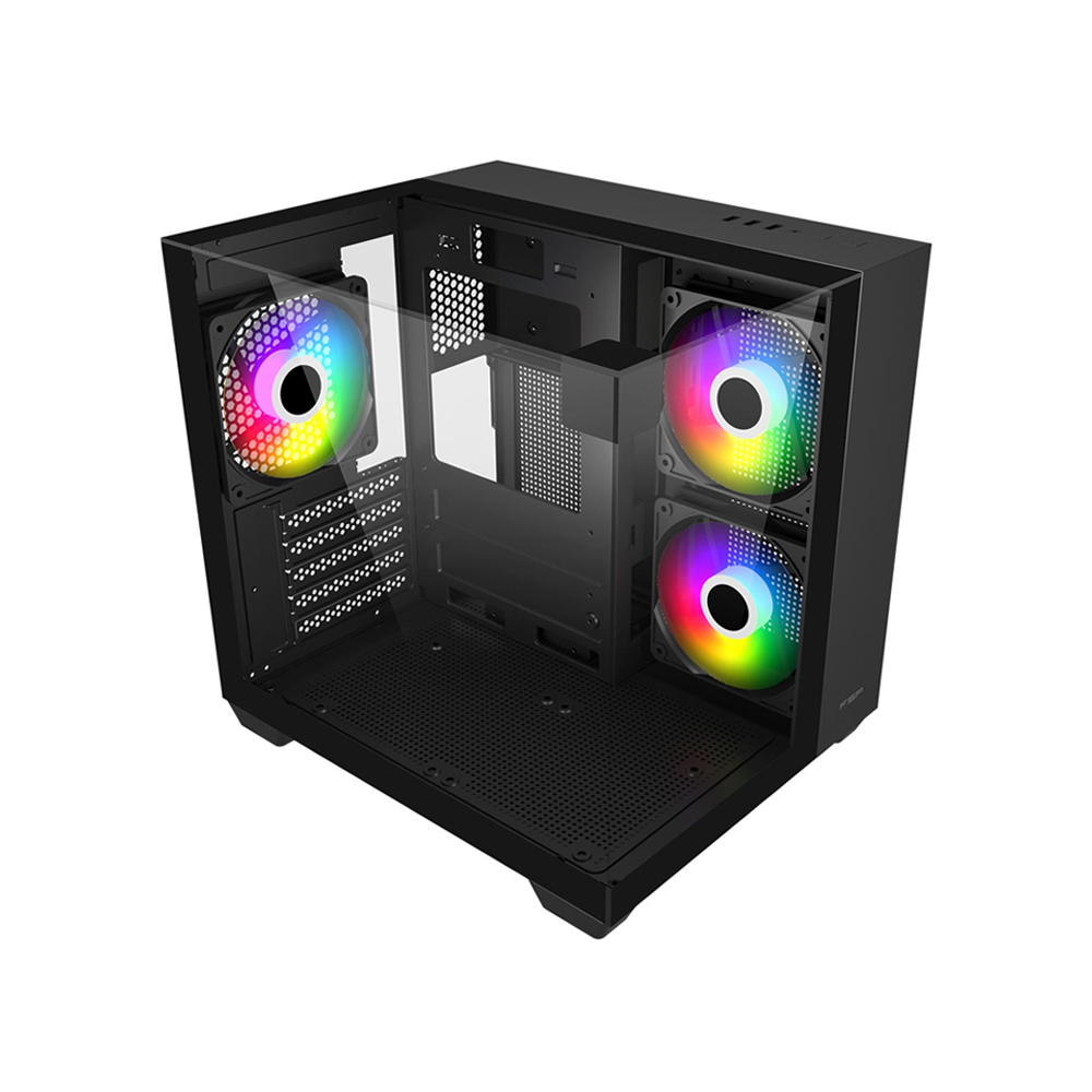 Compact ARGB Design with Tempered Glass - Features a sleek, space-saving Micro-ATX case design with a tinted tempered glass side panel and integrated ARGB lighting for eye-catching visuals and component display.