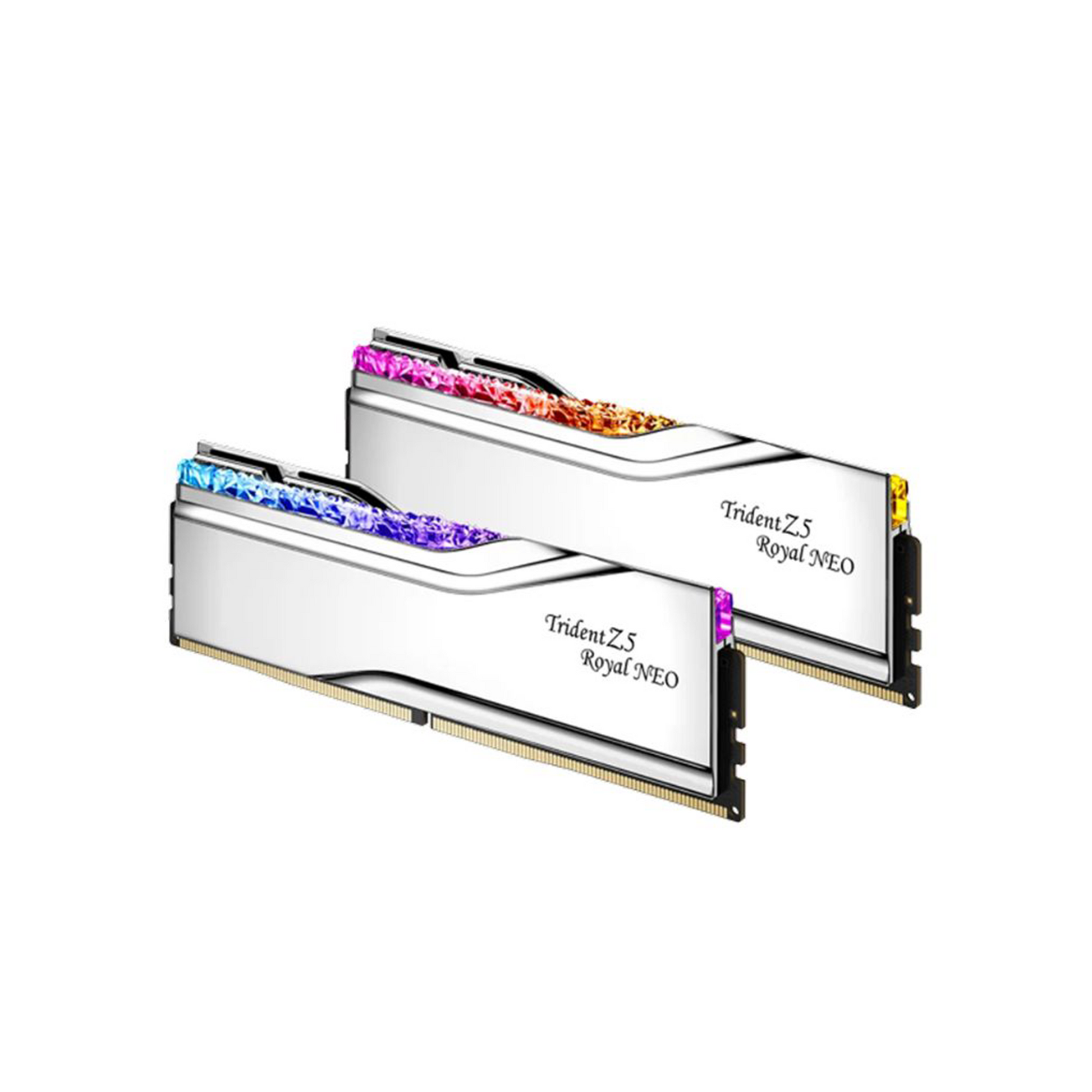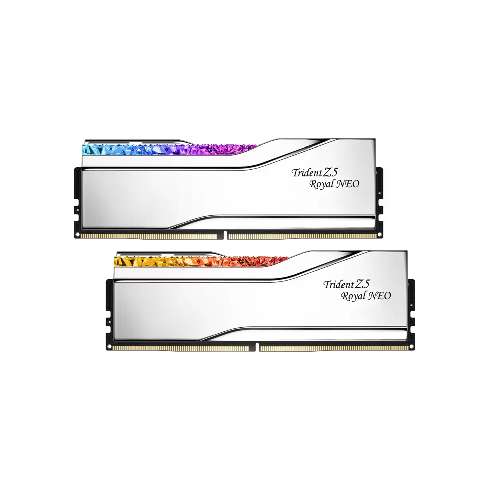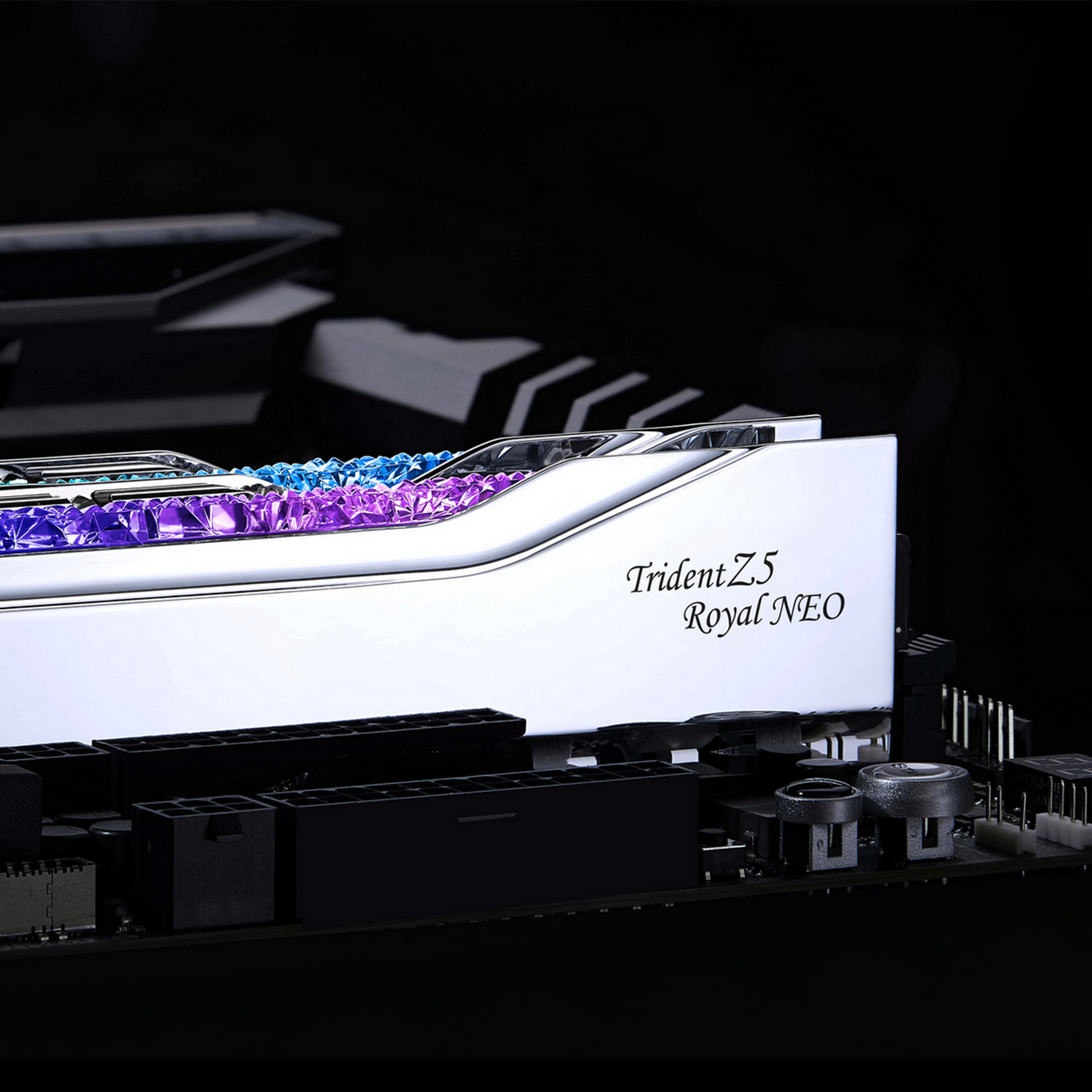 The G.SKILL Trident Z5 Royal Neo RGB DDR5 memory combines luxurious aesthetics with high-performance capabilities, tailored for AMD AM5 platforms. Featuring a crystalline light bar atop electroplated aluminum heatspreaders in gold or silver, it offers customizable RGB lighting. With AMD EXPO support, it ensures effortless overclocking for enhanced system performance.