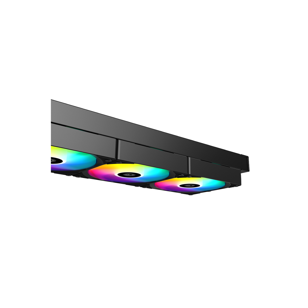 Triple 120mm PWM Fans - Three 120mm ARGB PWM fans delivering up to ~58 CFM airflow with low-noise operation around 27 dB(A).