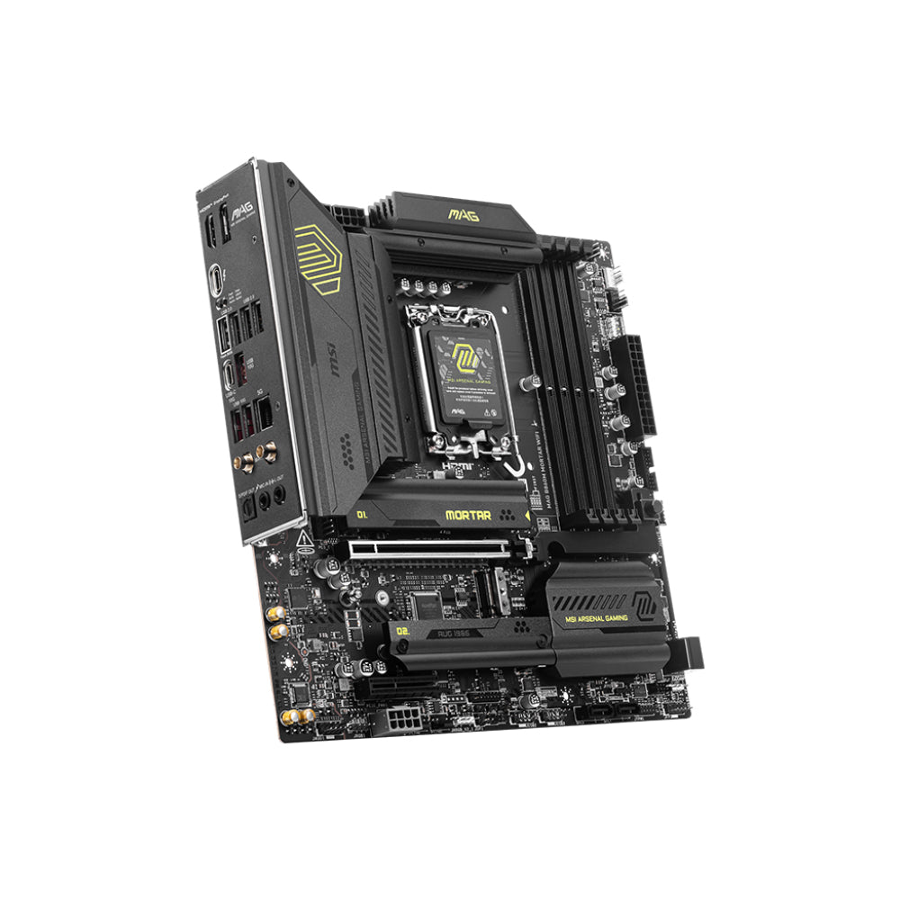 The MSI MAG B860M Mortar WiFi is a premium micro‑ATX board for Intel Core Ultra 200 (LGA 1851). It supports DDR5 (OC to 9200+ MT/s), PCIe 5.0 GPU & M.2 slots, triple M.2 drives, Thunderbolt 4, Wi‑Fi 7, 5 GbE LAN, and a robust VRM—offering high-end features in a compact form factor.