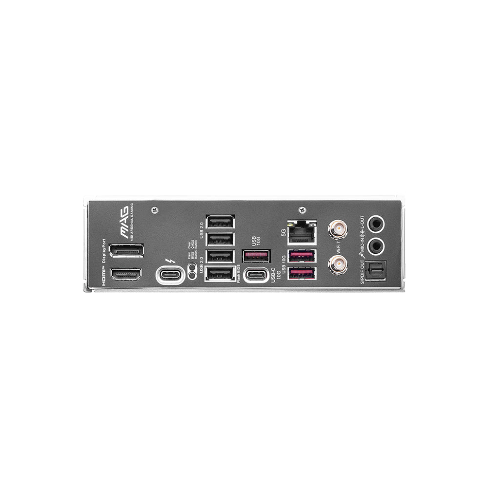 Premium Networking & I/O - Integrated Wi‑Fi 7 + Bluetooth 5.4, Intel Killer 5 GbE LAN, rear Thunderbolt 4 Type-C (40 Gb/s + DP alt), USB 10 Gbps Type‑A/C, HDMI 2.1/DP 1.4, and clear CMOS/BIOS flash buttons.