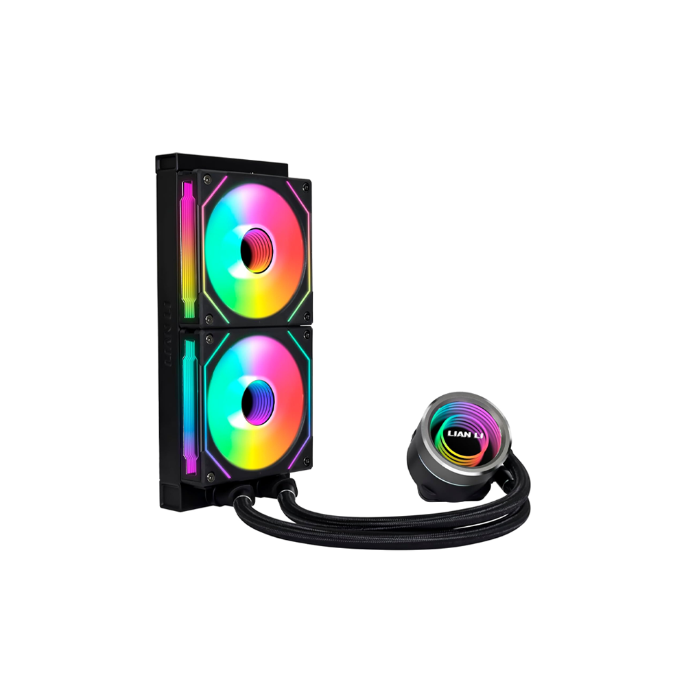 240 mm all-in-one AIO liquid CPU cooler with high-speed pump, slim 240 mm radiator, dual 120 mm UNI FAN SL-INF ARGB fans, wide socket support and customizable lighting — built for both performance and aesthetics.