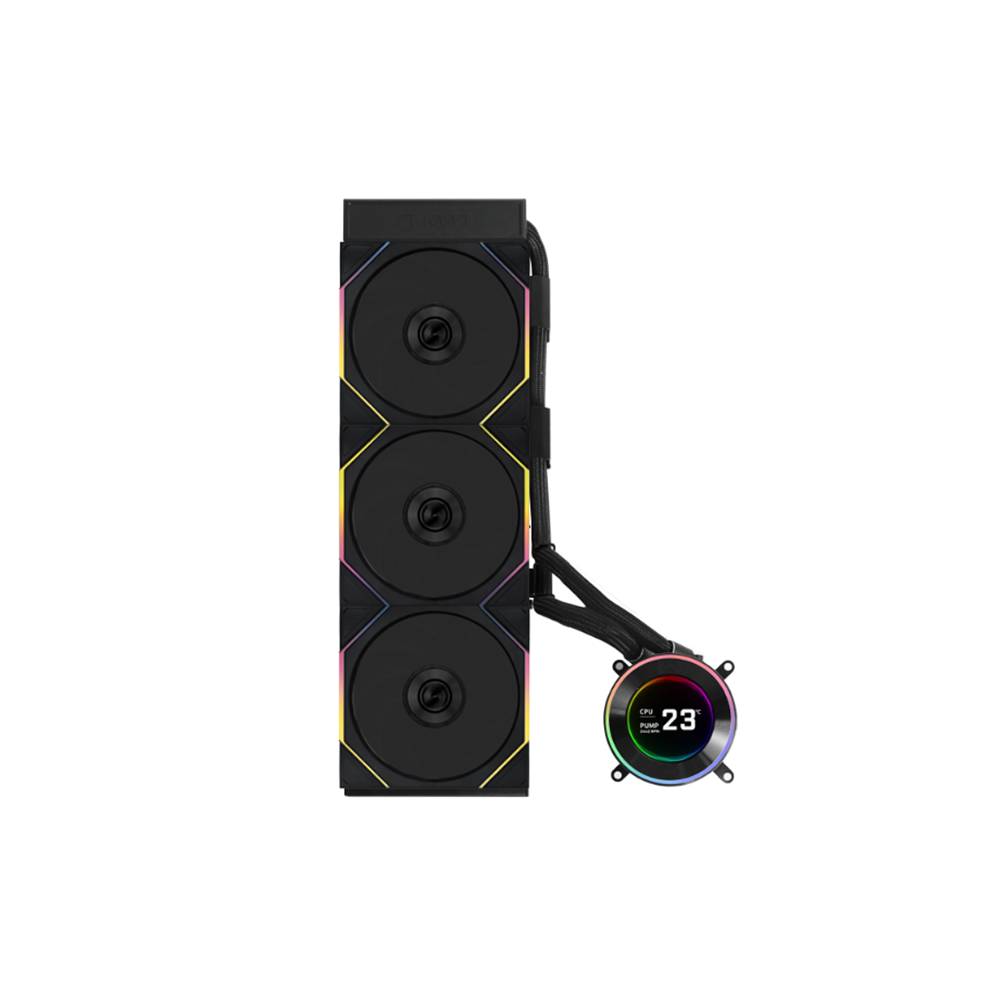 360 mm AIO liquid CPU cooler with a built-in 2.1" IPS LCD, compact aluminium radiator, side-mounted tubing and pre‑installed high-performance fans — combining efficient cooling, modern aesthetics, and wide socket compatibility.