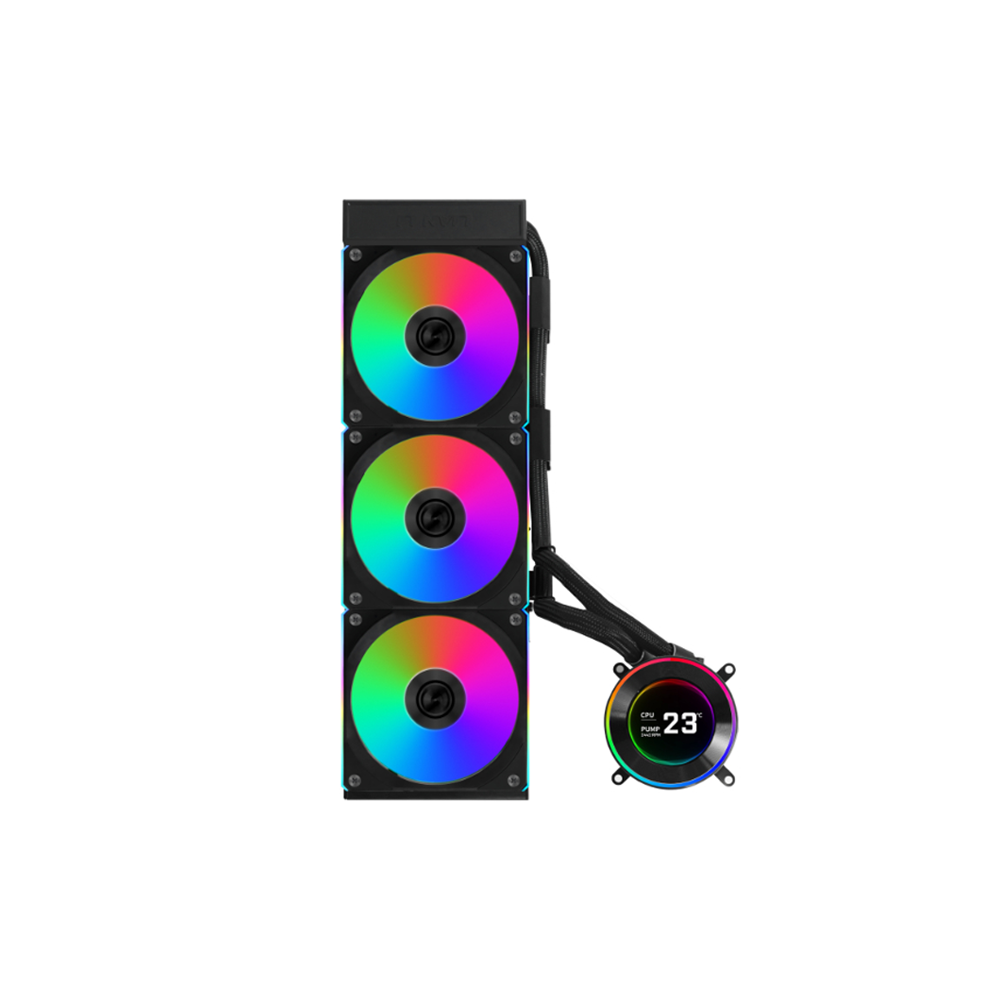 Slim 360 mm Radiator & Side‑Mounted Tubes - Radiator dimension: 400 × 122 × 24 mm (slimmer than many 360 mm AIOs), using aluminium alloy; side‑mounted tubing and concealed wiring deliver a near “tubeless” interior look, improving case compatibility and aesthetics.