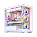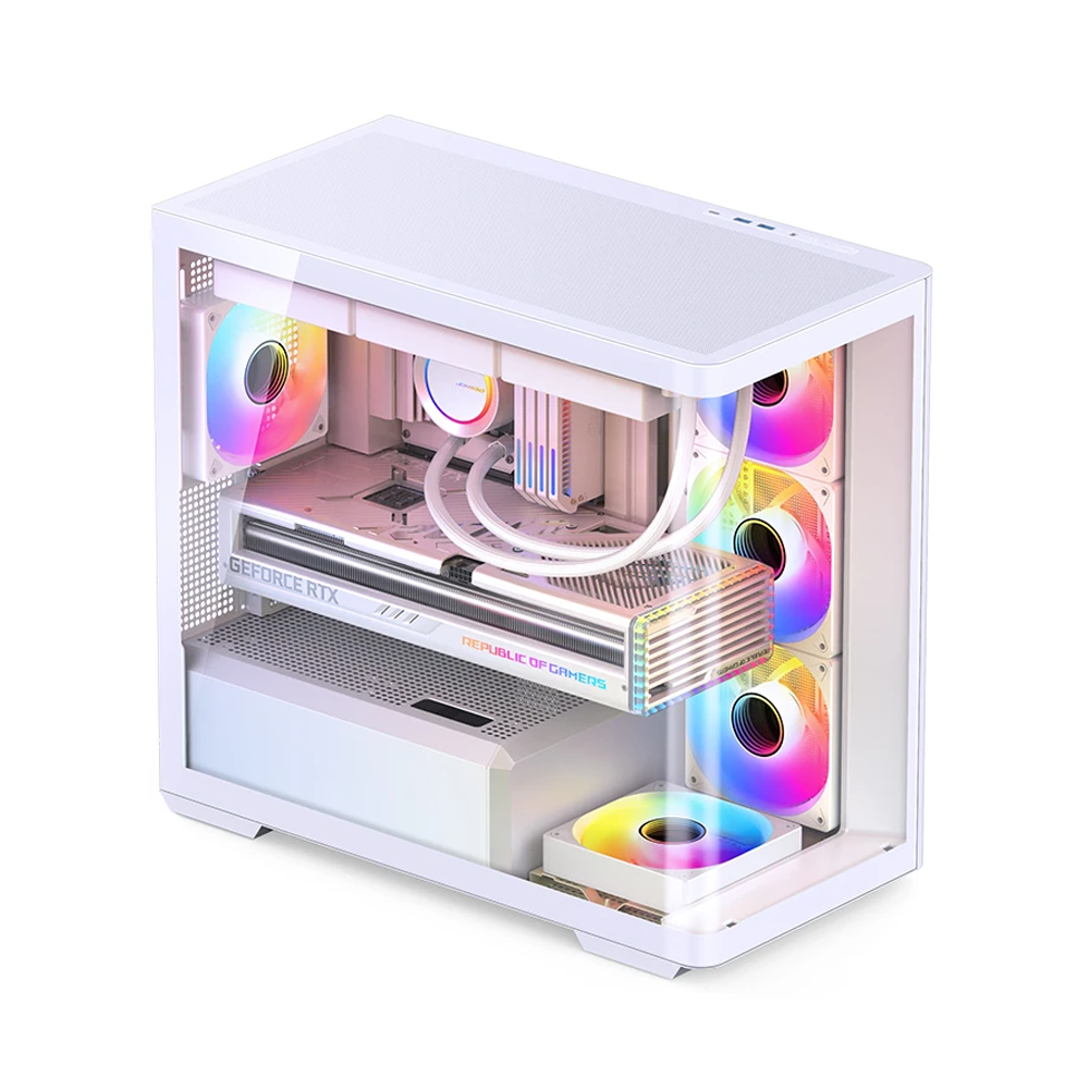 The Jonsbo D300 White is a premium Micro-ATX chassis with a panoramic 270° curved tempered glass front and side design, built for flexibility and strong cooling. Supporting Micro-ATX and Mini-ITX boards, long GPUs, and multiple fan/radiator setups, it combines elegant aesthetics with performance-oriented airflow and modern connectivity.