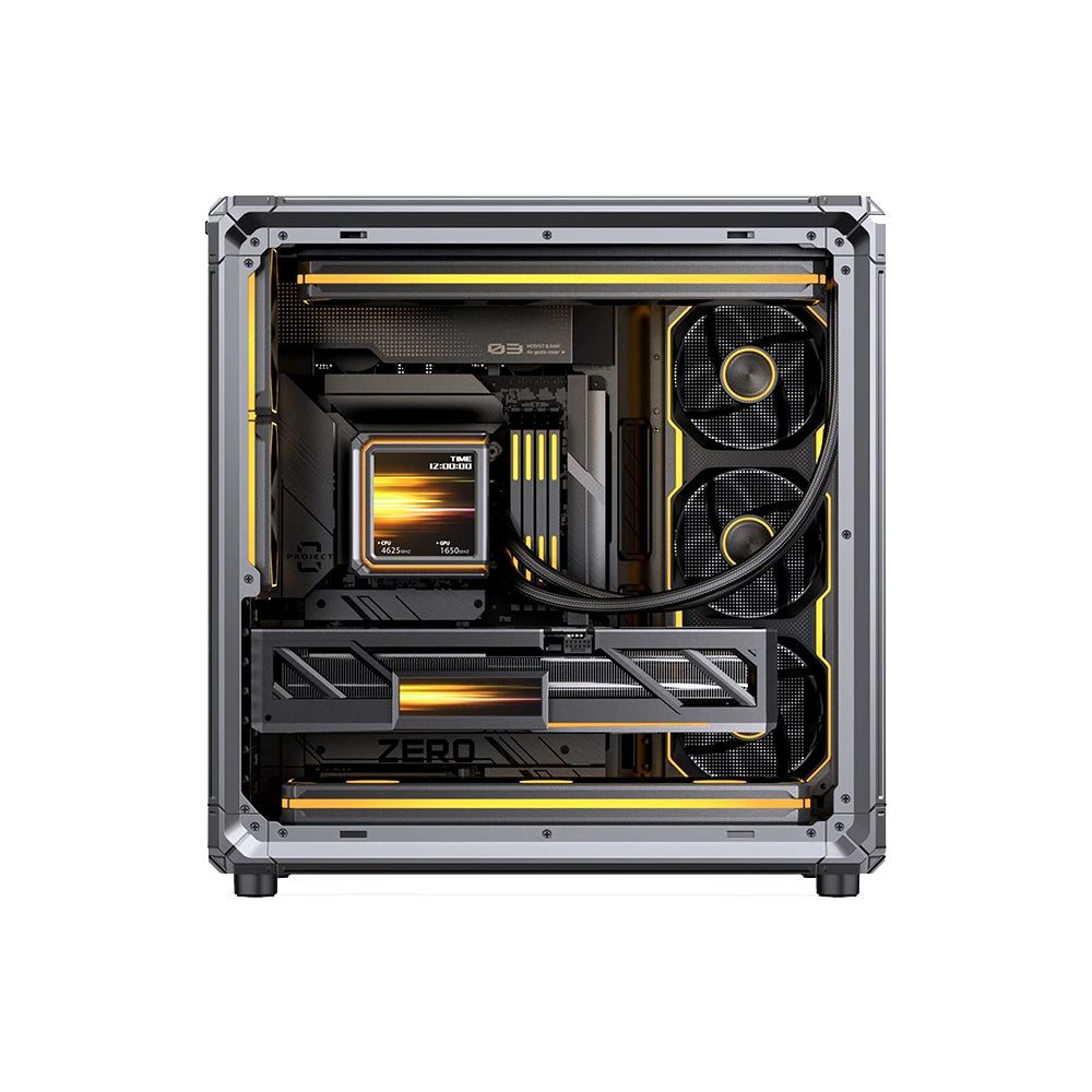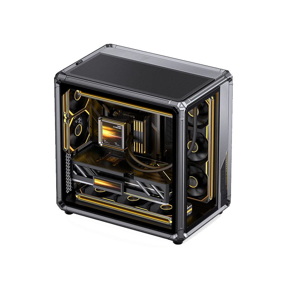 Dual‑Compartment & Aesthetic Structure - Utilises a rugged skeleton frame design with left/right compartment separation and double tempered glass side panels to enhance visual appeal and give clean hardware presentation.