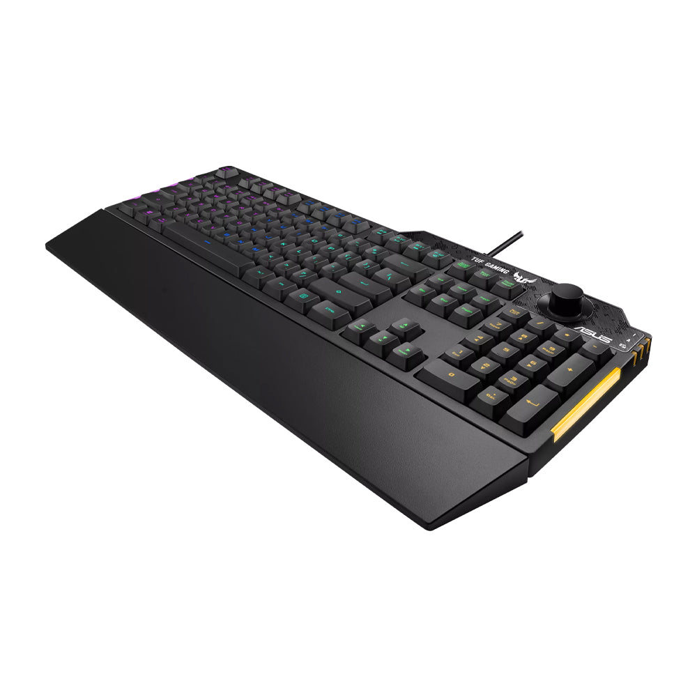 The TUF Gaming K1 Keyboard is a durable and responsive gaming keyboard designed for long-lasting performance. Featuring silent tactile switches, spill-resistant design, dedicated media controls, and customizable RGB lighting, it delivers reliable control and comfort for gaming and everyday use.