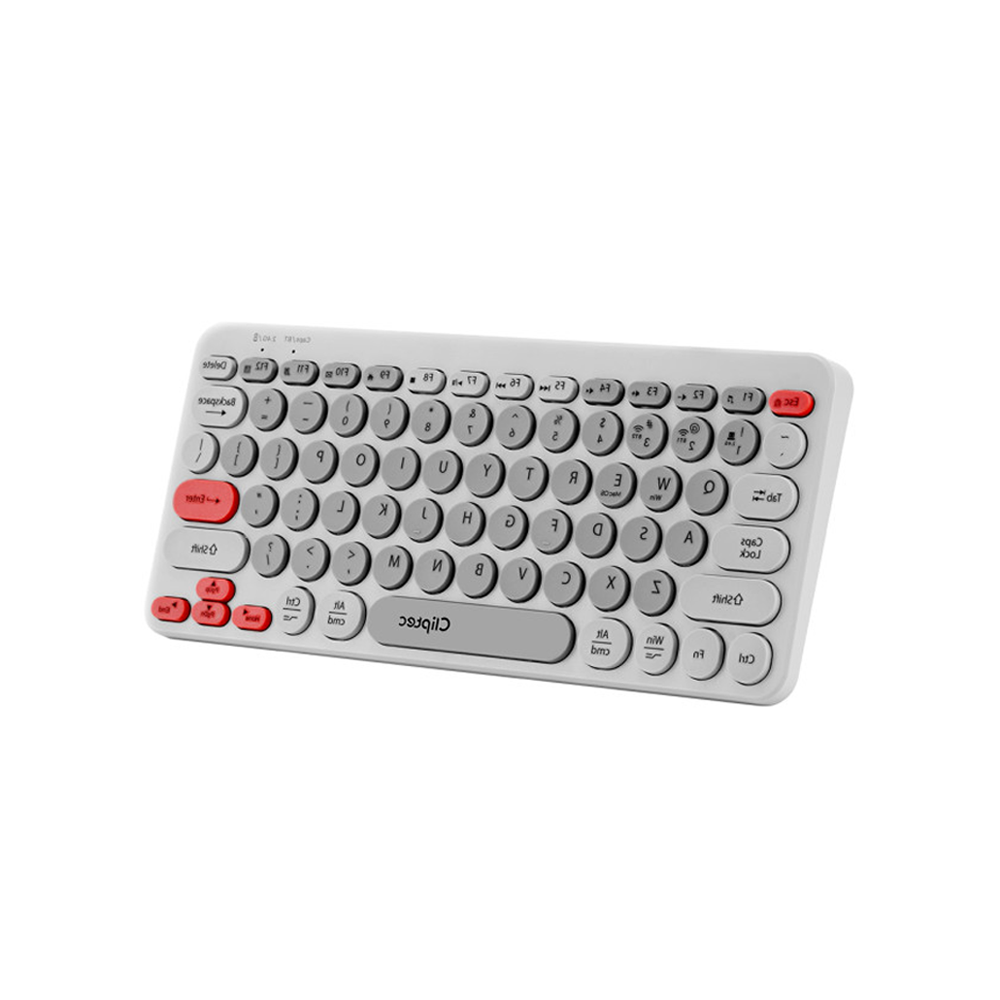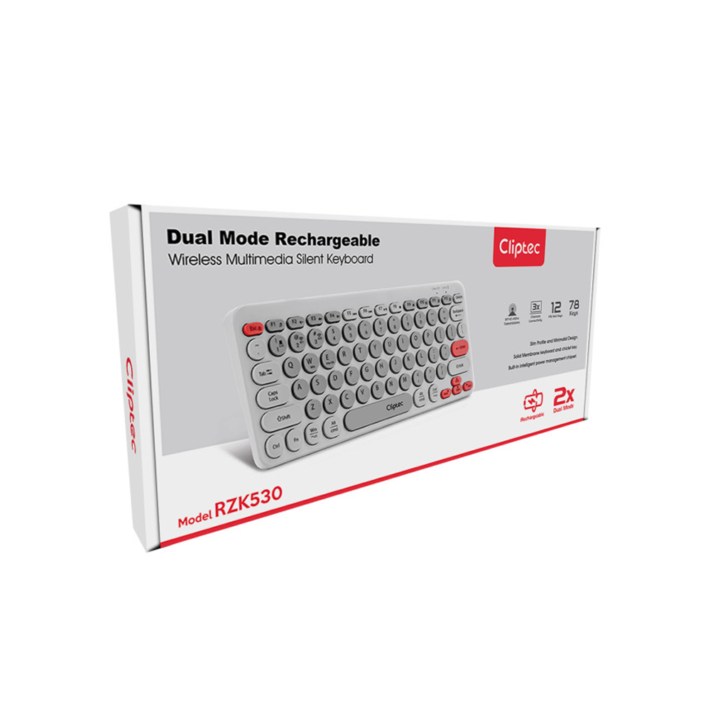 The CLiPtec RZK530 is a dual-mode wireless keyboard featuring Bluetooth and 2.4 GHz USB connectivity, rechargeable battery, silent keypresses, and multimedia keys—perfect for productive and quiet typing.