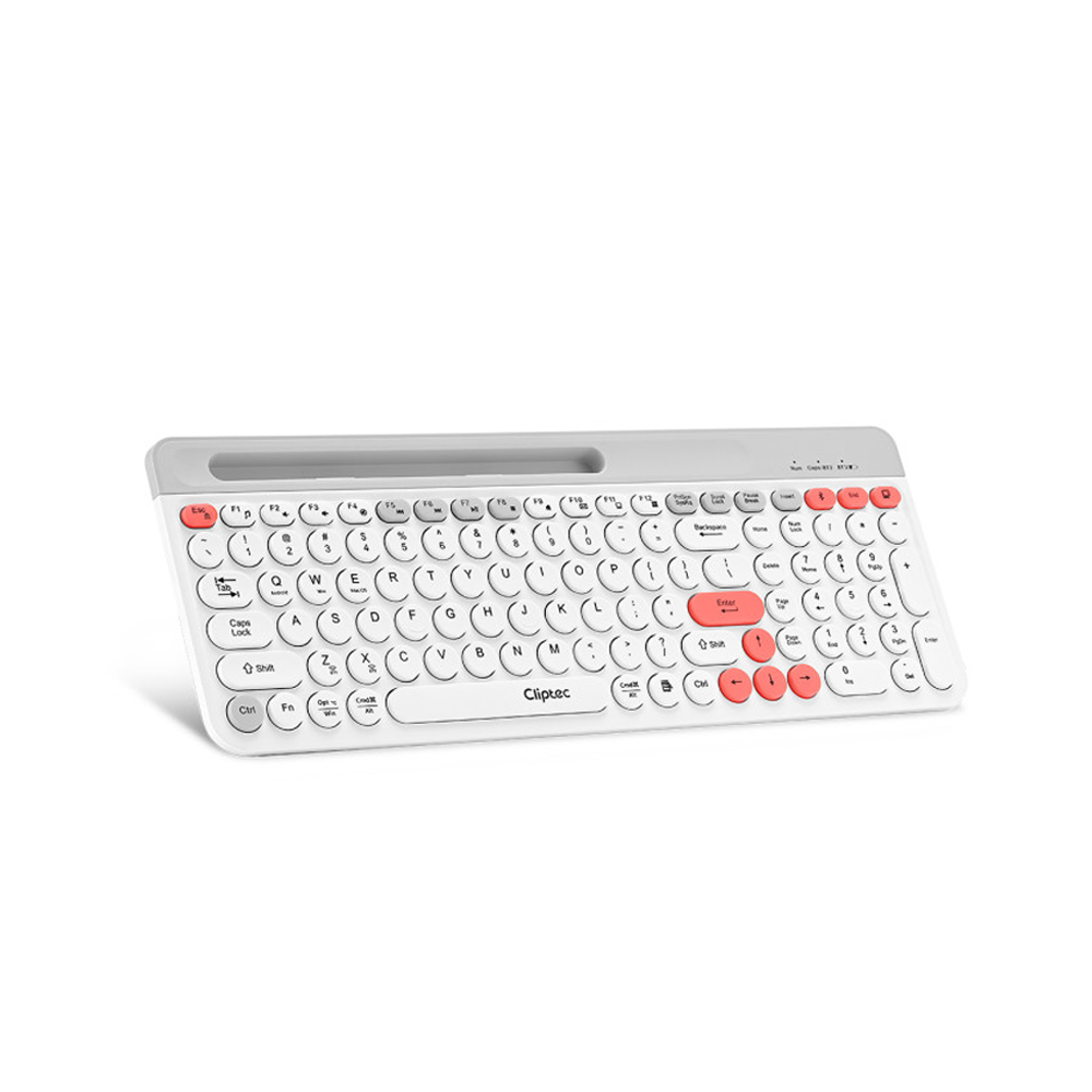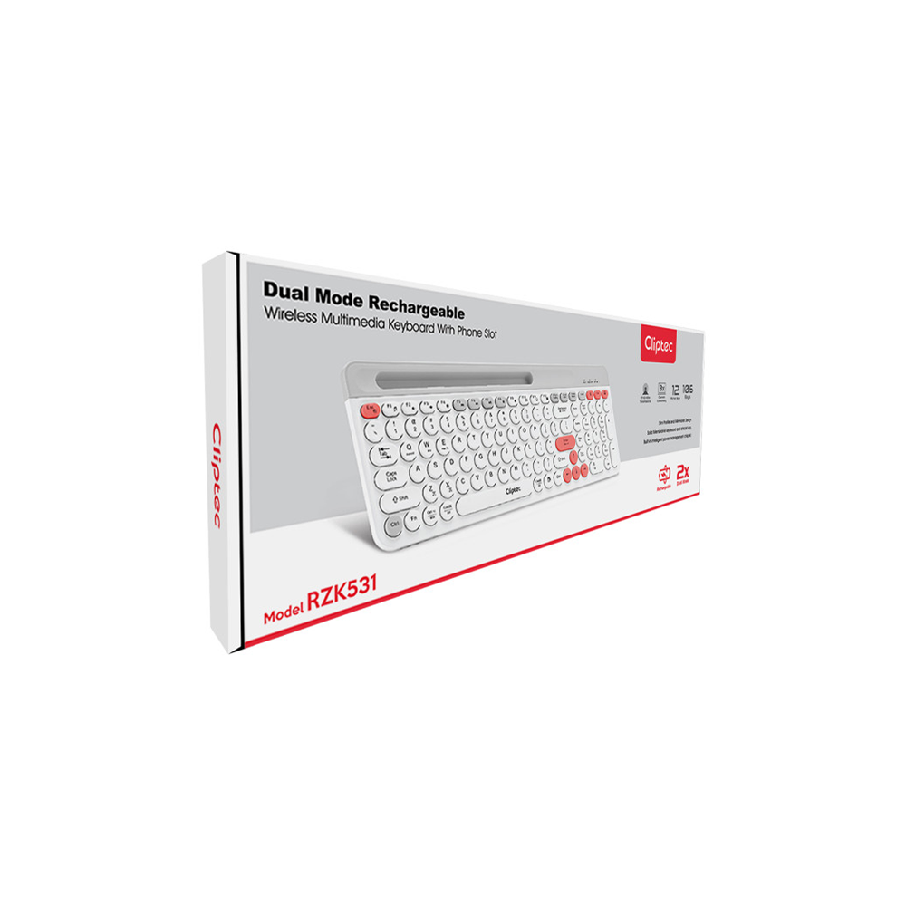 The CLiPtec RZK531 is a dual-mode wireless keyboard with Bluetooth and 2.4 GHz USB connectivity, rechargeable battery, and multimedia shortcut keys—designed for efficient, versatile, and comfortable typing.