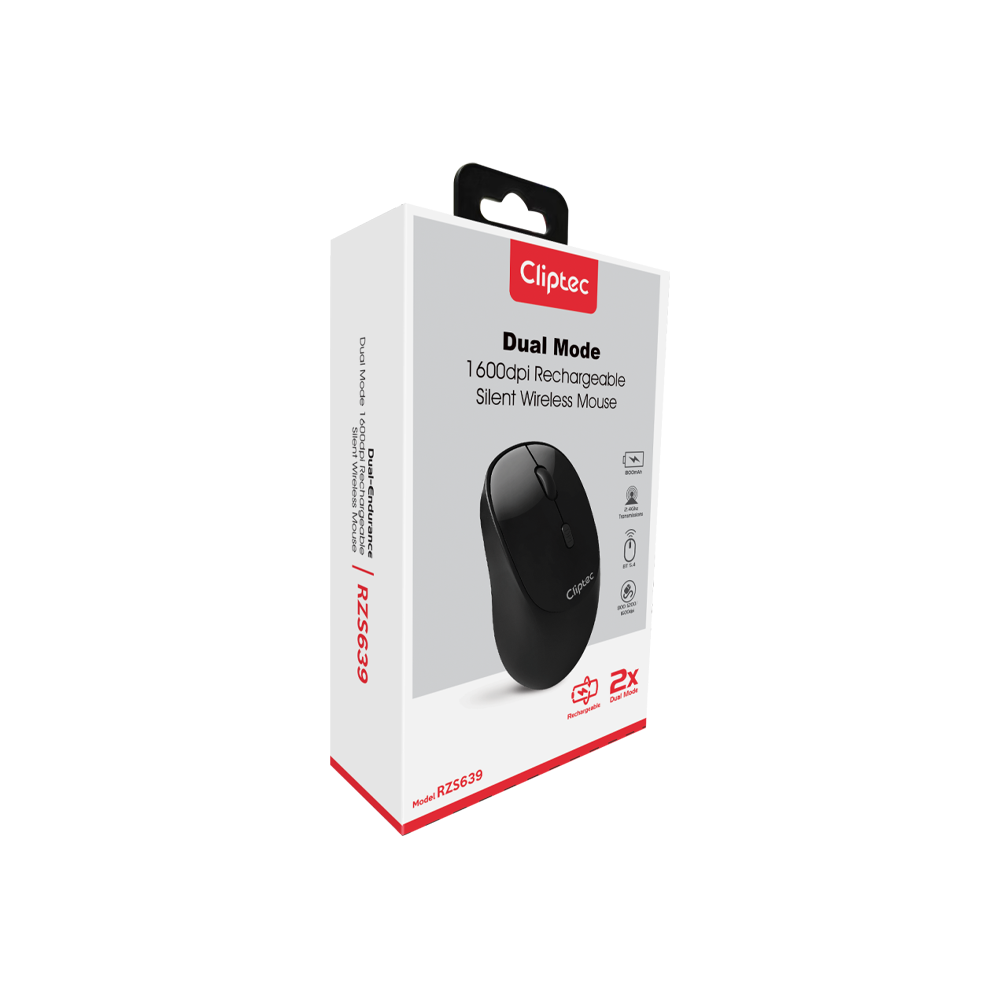 A dual-mode (2.4 GHz + Bluetooth) wireless mouse from CLiPtec — the RZS639 — offering up to 1600 DPI, silent-click operation, rechargeable battery, and ergonomic ambidextrous design — ideal for office work, browsing, and everyday productivity.