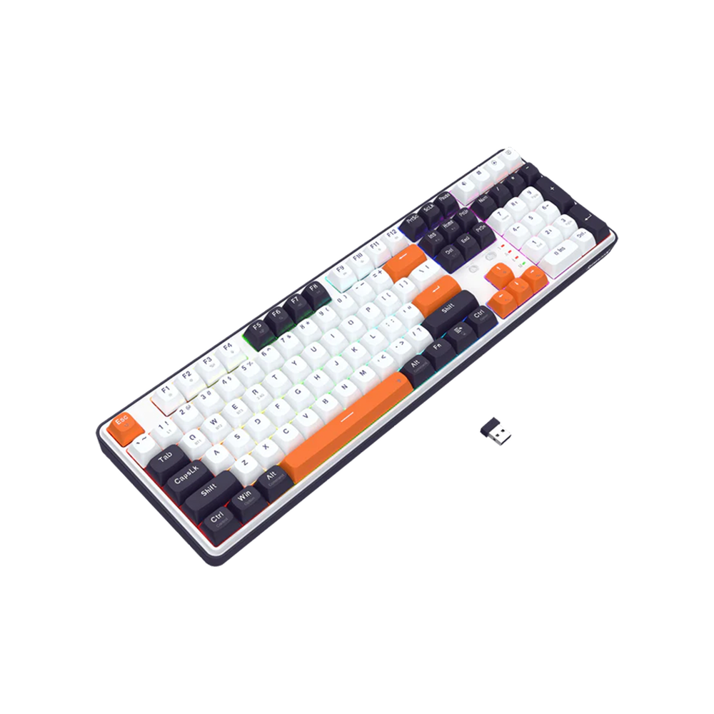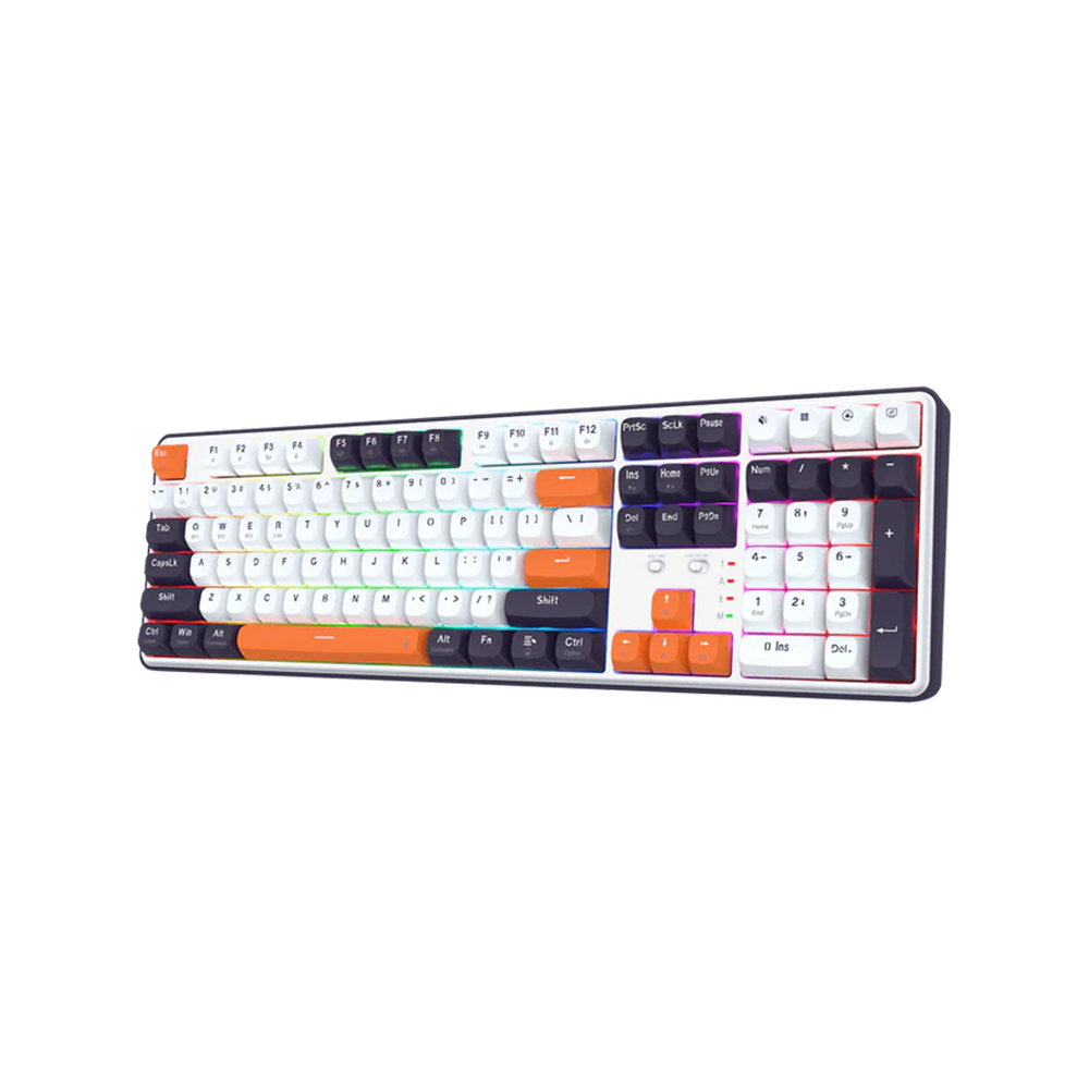 The Redragon WYVERN K689 PRO Gaming Keyboard - White Orange Black features a 108-key layout with tri-mode connectivity (USB-C, 2.4Ghz, Bluetooth), hot-swappable Mint Mambo switches, and vibrant RGB lighting. With gasket construction and PBT keycaps, this SEO-optimized keyboard ensures precision and comfort for gaming and productivity.