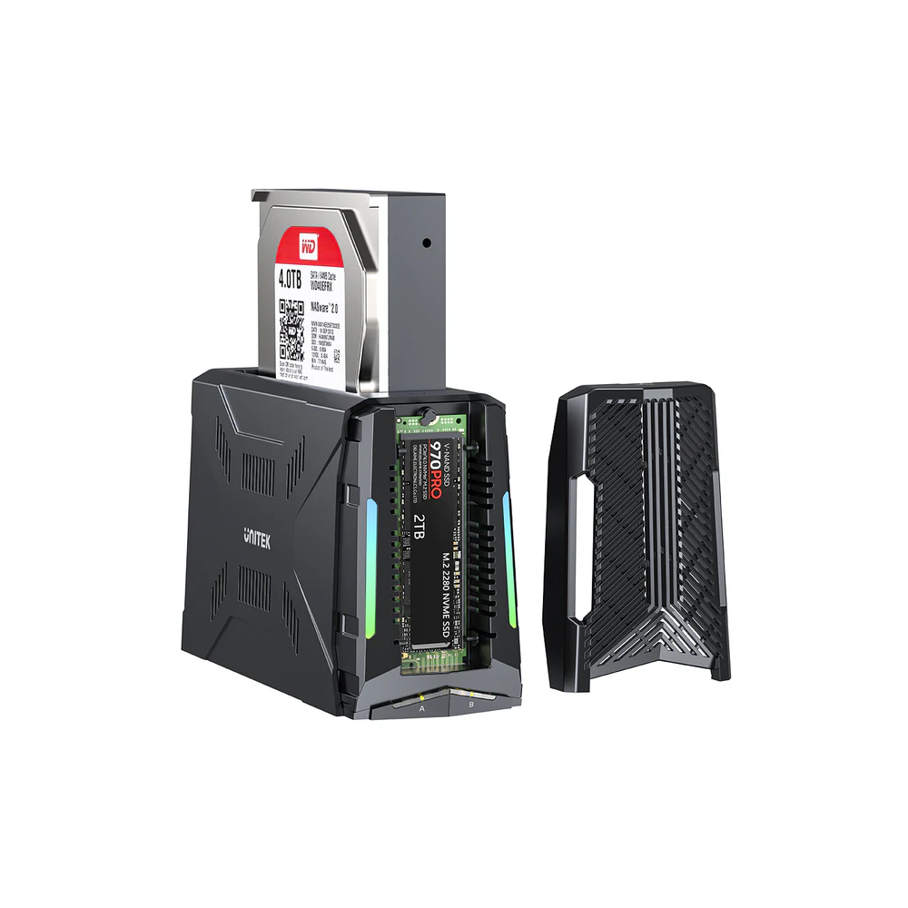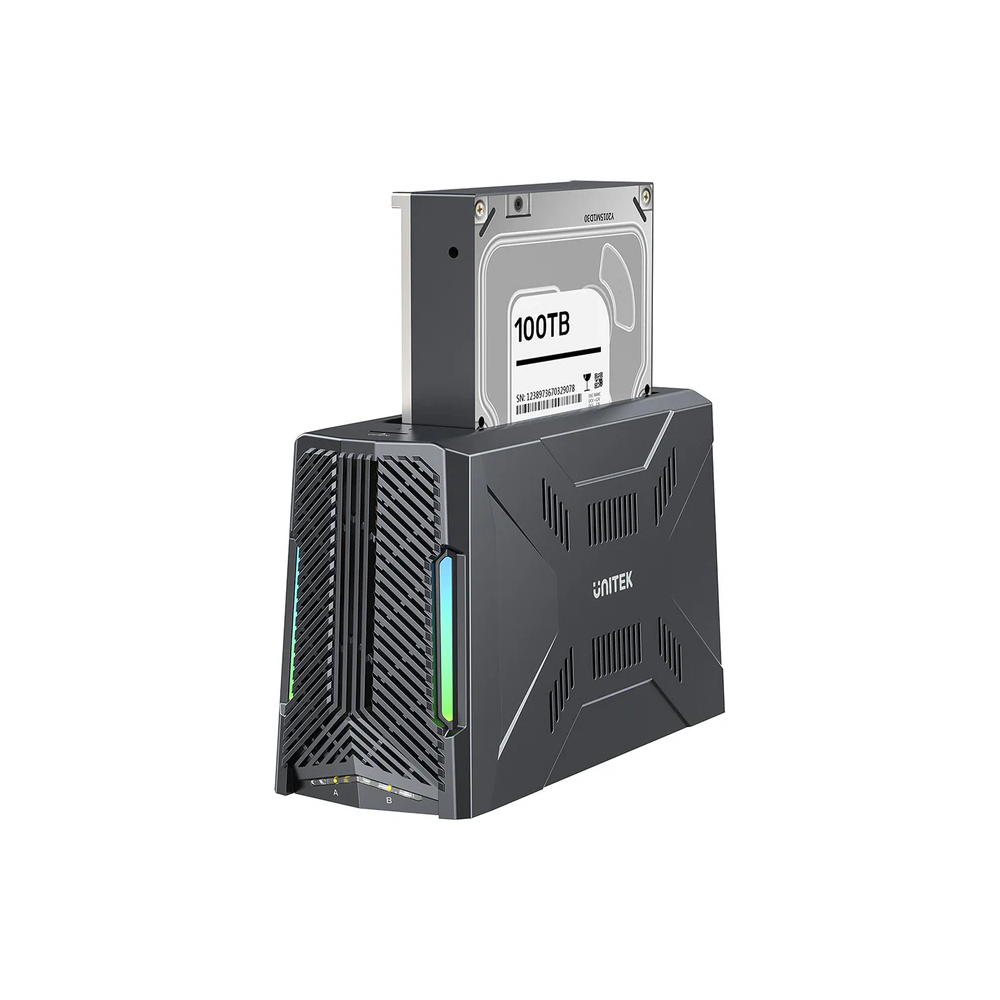 Elevate your storage with the UNITEK USB-C Enclosure Docking Station in Black. Supporting M.2 NVMe and 2.5"/3.5" SATA drives, it offers 10Gbps transfers, simultaneous dual-drive access, and RGB LEDs for efficient, stylish data management.