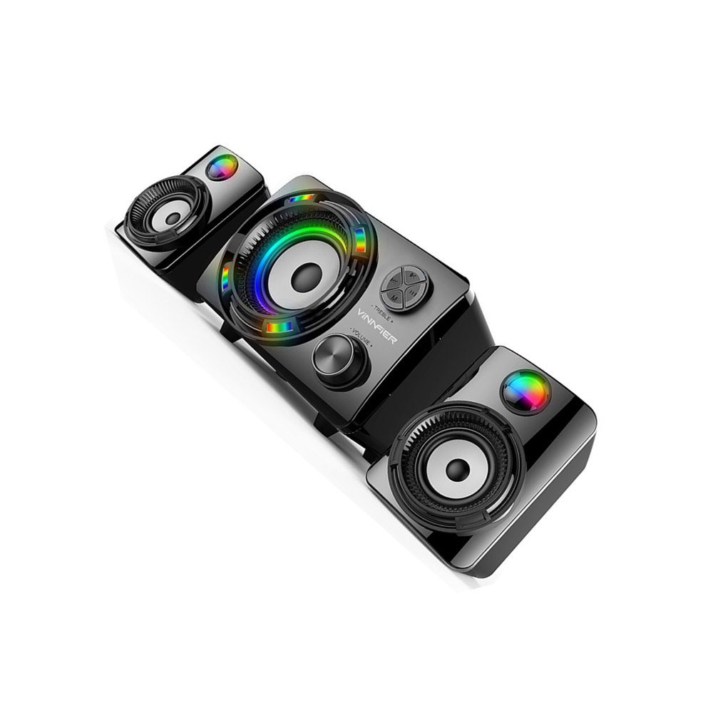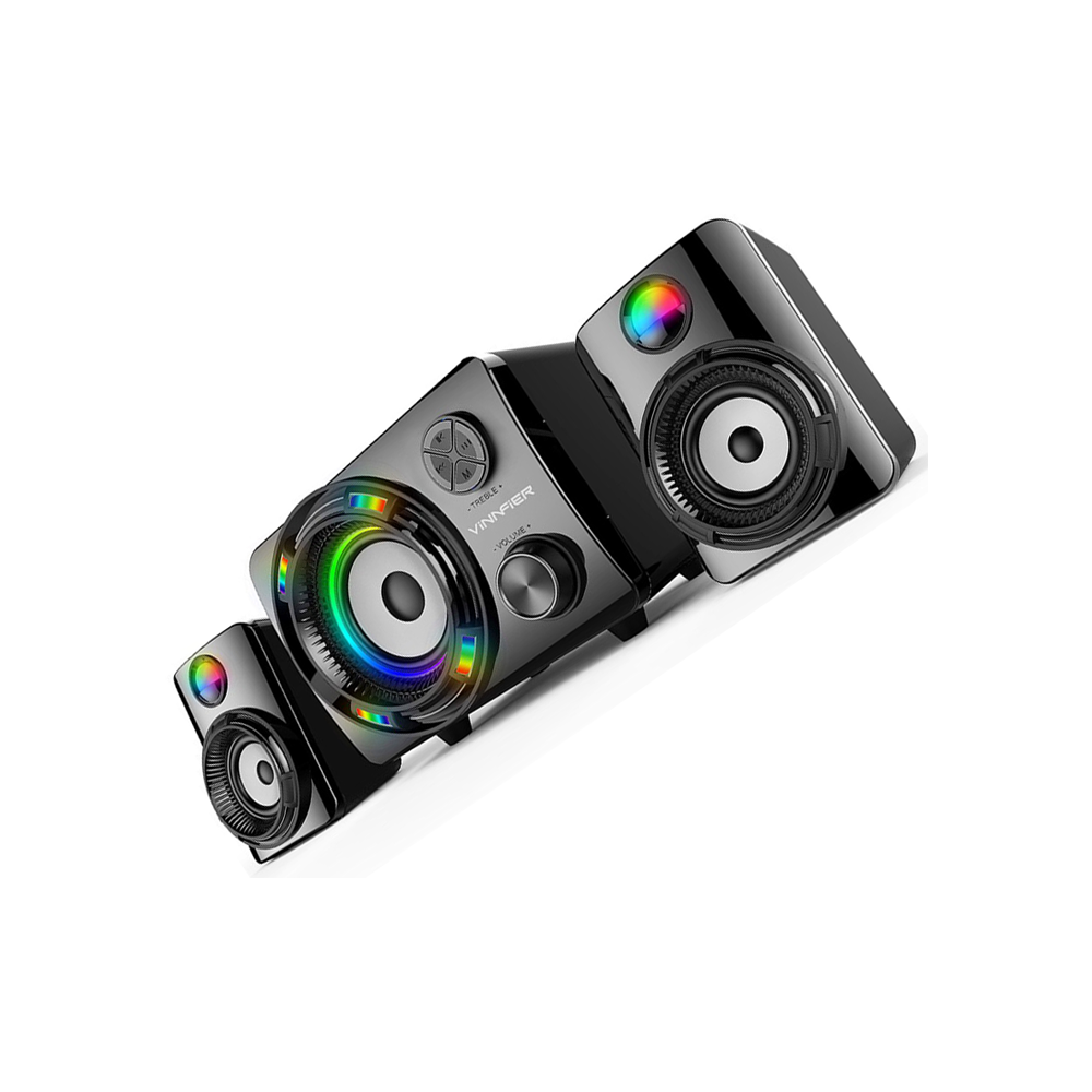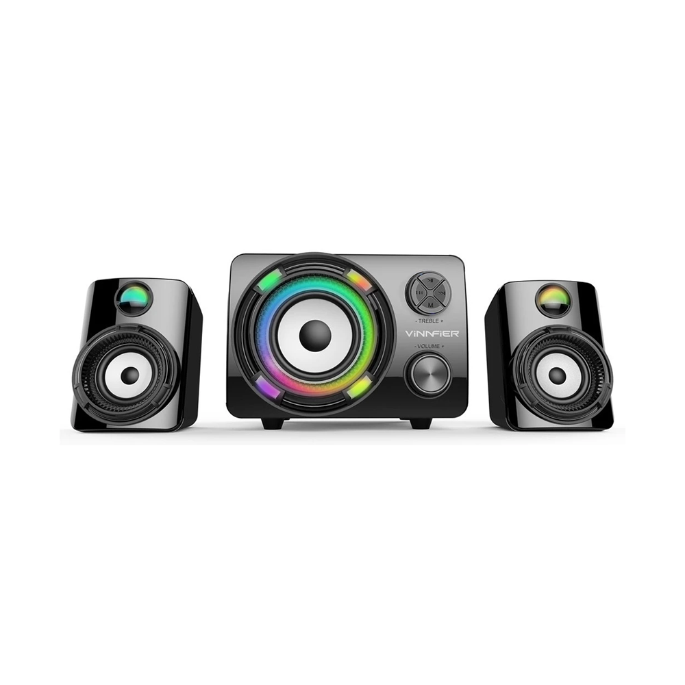 Experience immersive home entertainment with the Vinnfier ECCO 3 BTR Home Speaker. This 2.1 Bluetooth speaker system delivers dynamic 24W RMS sound with powerful bass, 7-color LED lighting, and multiple connectivity options. Ideal for living rooms and workspaces, it combines style, functionality, and high-quality audio performance.