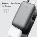 Optimized dual USB Ports USB-C - Max Output/Input 18W and USB-A Max Output 18W. Dual Outputs allow you to charge two devices simultaneously, and it can also supports pass-through charging and recharge the power bank Intelligent
