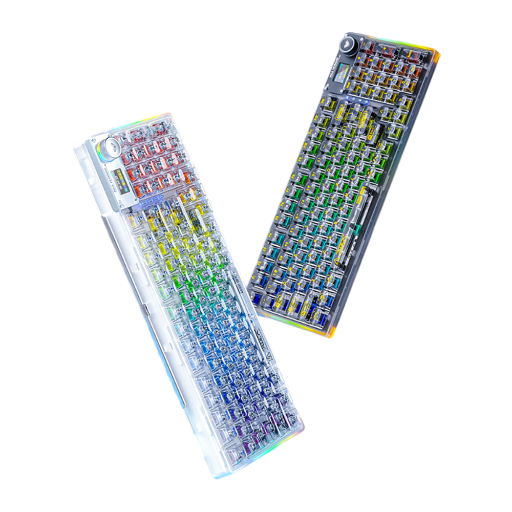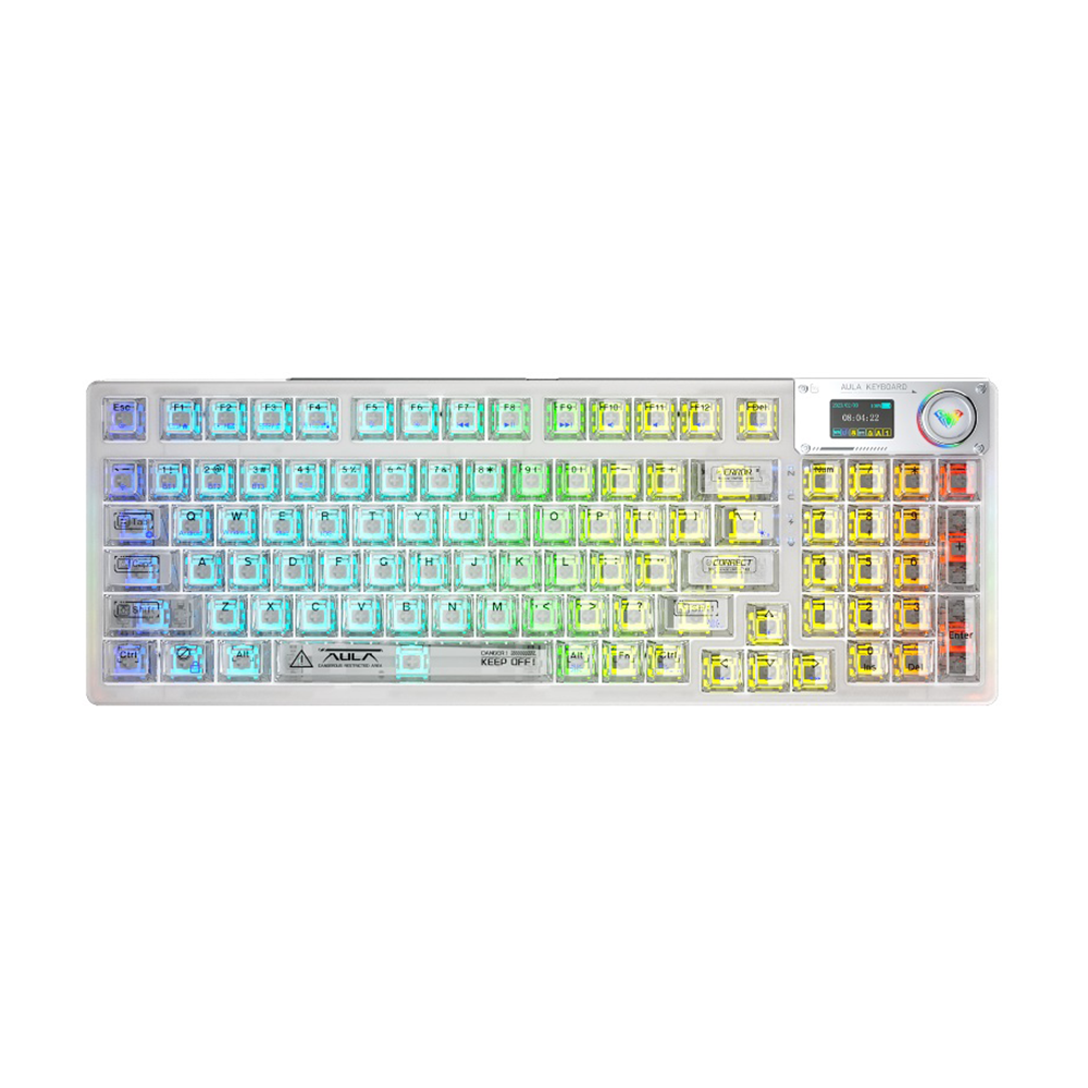 The AULA F98 PRO Transparent Mechanical Keyboard in [Black/White], featuring Ice Crystal switches, offers a premium typing experience. With tri-mode connectivity, hot-swappable switches, vibrant RGB lighting, and a 1.14-inch LCD display, it’s perfect for gaming and productivity, blending style and performance.