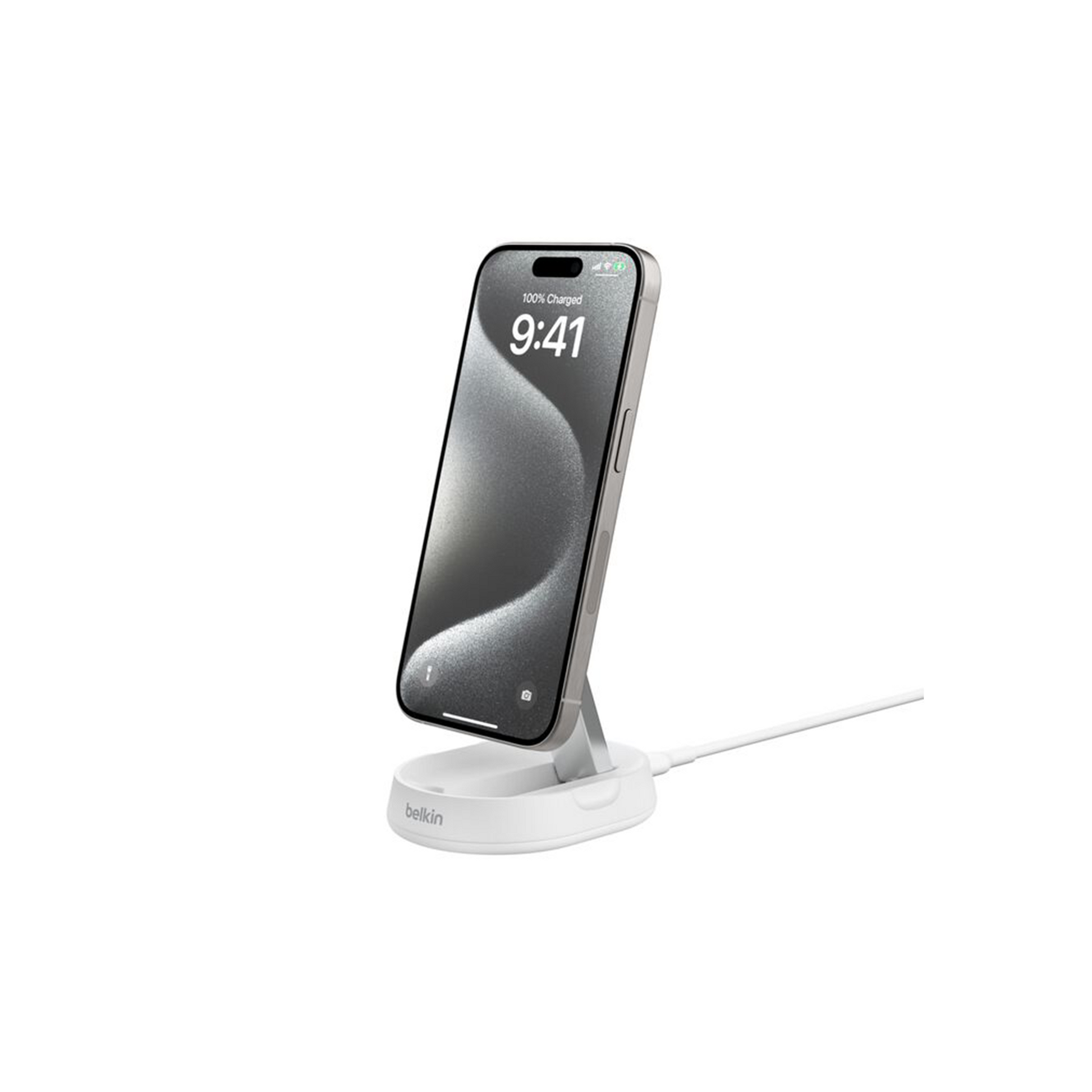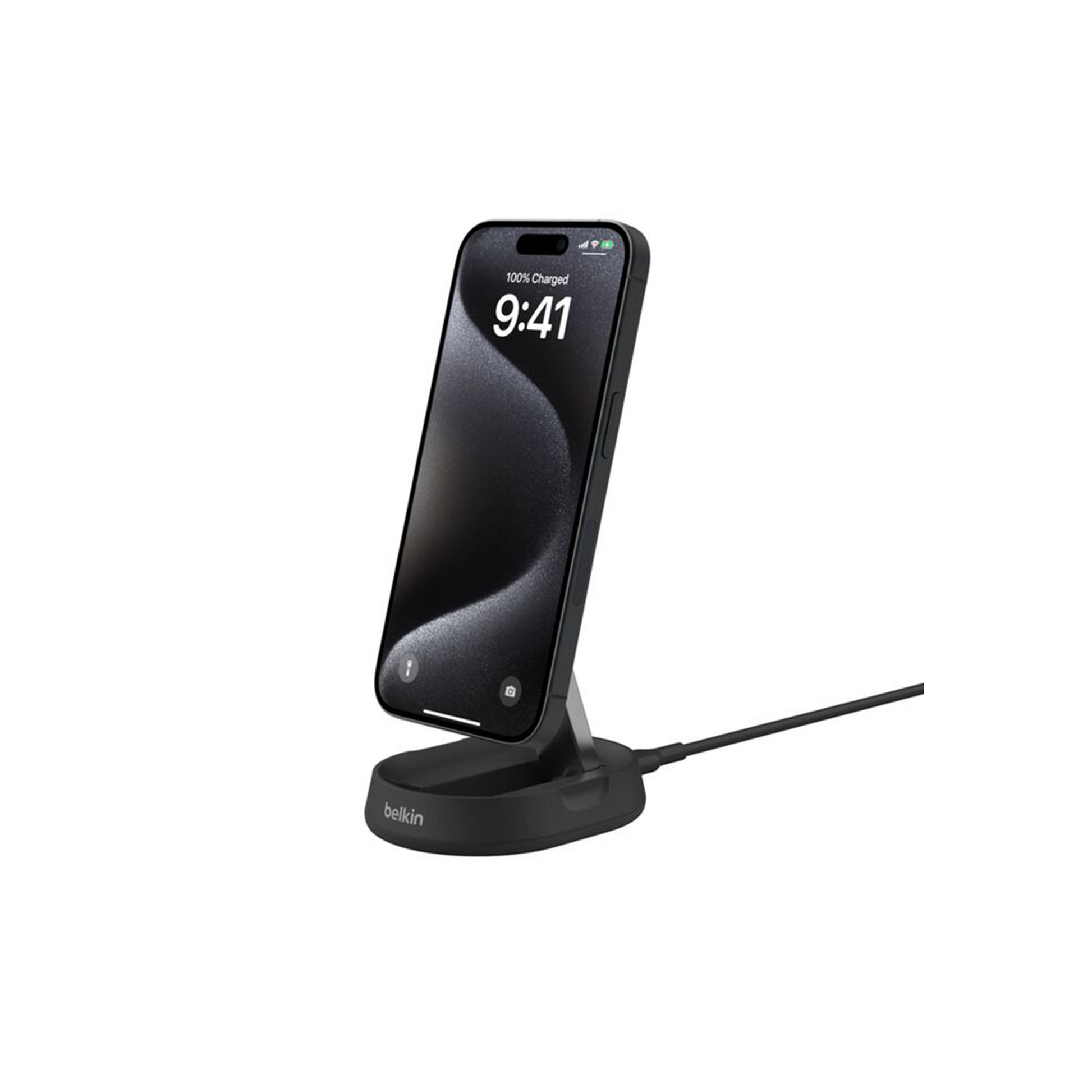 The Belkin BoostCharge Pro Convertible Magnetic Wireless Charging Stand (Model: WIA008BTBK) is a versatile and travel-friendly charger designed for Qi2-compatible devices. It delivers up to 15W of fast wireless charging and features a foldable design that allows it to function as both a stand and a pad. The adjustable tilt supports viewing angles from 0° to 70° in stand mode and 0° to 75° in pad mode, making it ideal for various use cases, including Apple's StandBy mode. Made from eco-friendly materials and packaged plastic-free, it includes a 5ft USB-C to USB-C cable and a 20W power supply.