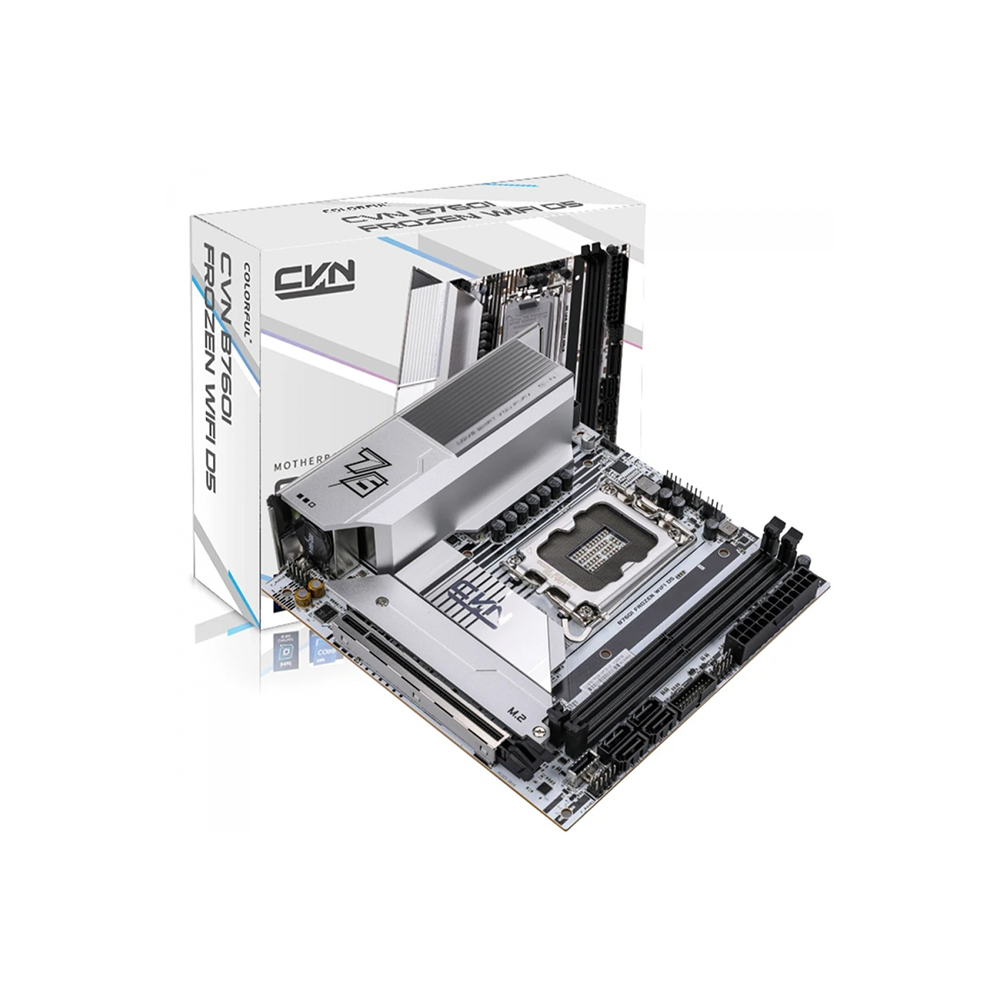 The Colorful CVN B760I FROZEN WiFi D5 V20 LGA1700 Mini-ITX motherboard delivers powerful performance in a compact form factor. Featuring support for Intel® 12th/13th Gen CPUs, DDR5 memory, dual M.2 slots, integrated Wi-Fi, and stylish aesthetics, it's perfect for small form factor gaming and productivity builds.