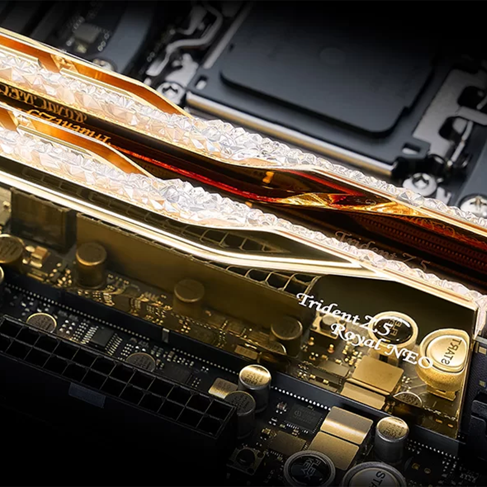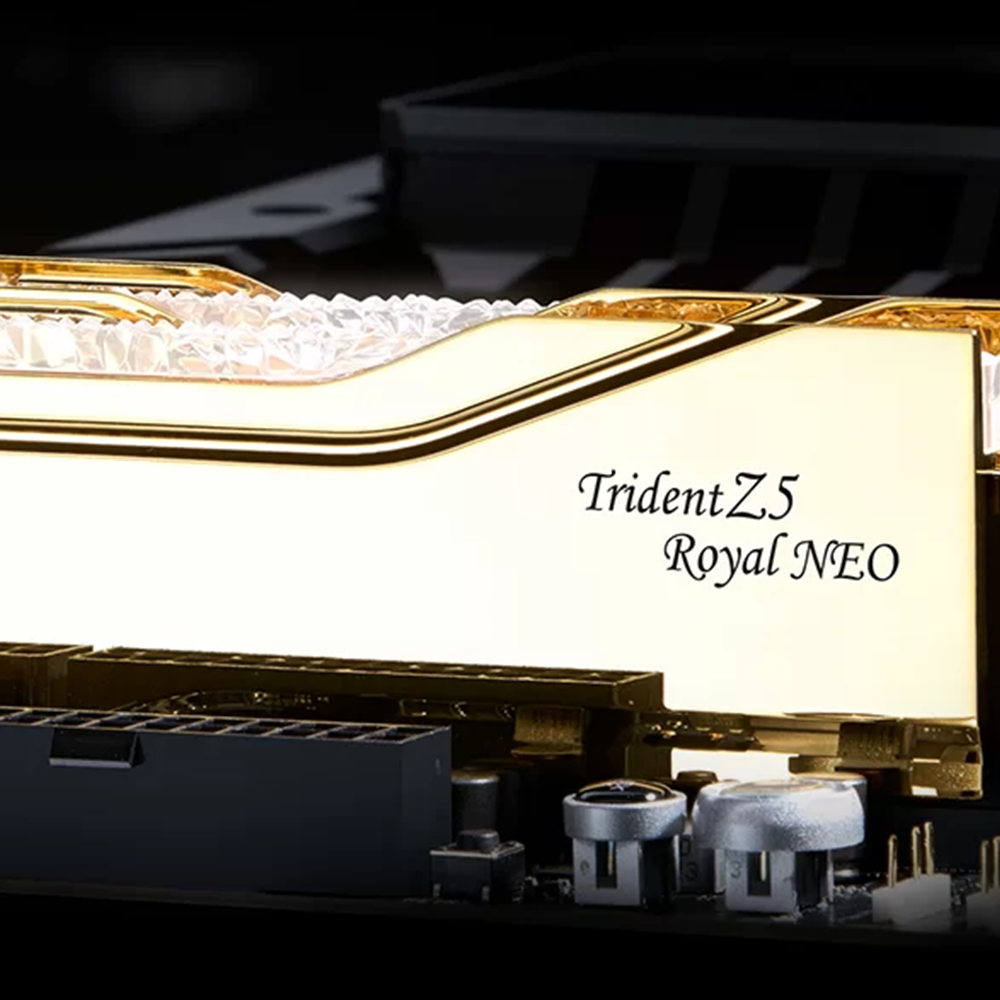 Premium Gold Electroplated Heatspreaders - The G.SKILL Trident Z5 Royal Neo features gold electroplated aluminum heatspreaders, ensuring efficient heat dissipation. Designed for AMD EXPO platforms, this 32GB DDR5 kit combines luxury aesthetics with robust performance for high-end PC builds.