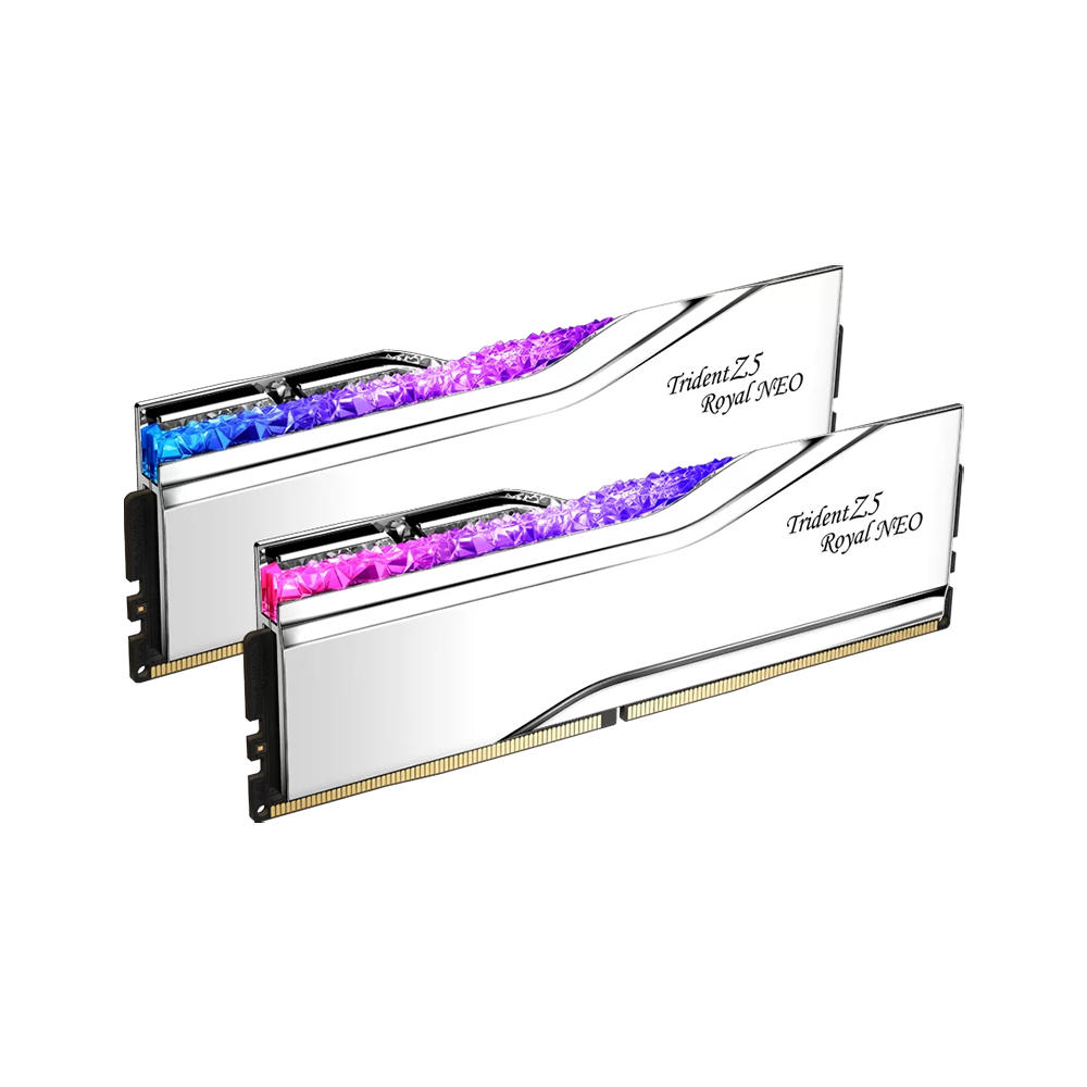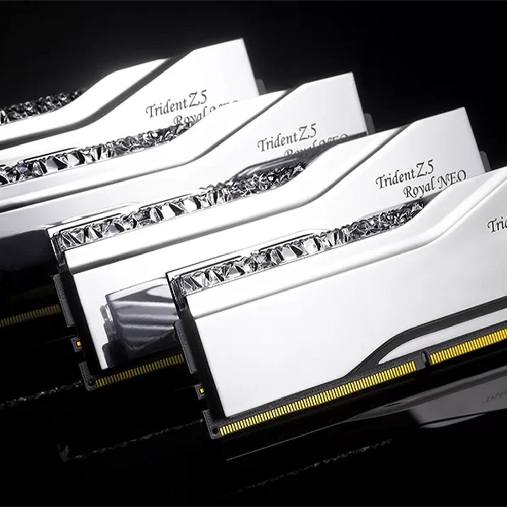 Premium Silver Electroplated Heatspreaders - The G.SKILL Trident Z5 Royal Neo 64GB DDR5 boasts silver electroplated aluminum heatspreaders for efficient heat dissipation. Designed for AMD EXPO platforms, it combines luxury aesthetics with reliable performance, ideal for high-end gaming and professional PC builds.