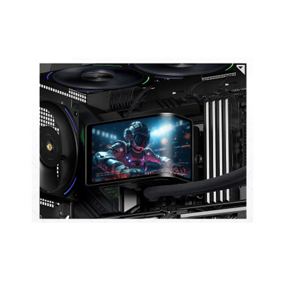 High-Speed Pump & 6.67″ Display Pump Block - Pump block size ~120.1 × 80 × 107 mm, with pump speed up to 6400 RPM ±10% (MAX) — delivers strong coolant circulation. The pump head features a 6.67″ curved LCD (2.4K 2400 × 1080) that can display system stats, custom graphics, GIFs or video. Screen is rotatable to suit installation orientation.