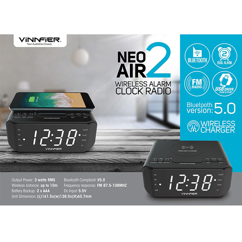 Enhance your audio experience with the Vinnfier Neo Air 2 Portable Speaker in Black. Featuring Bluetooth 5.0, wireless charging, dual alarm clock, FM radio, and 3W RMS output, this speaker delivers versatile, high-quality sound for music, travel, and home use.